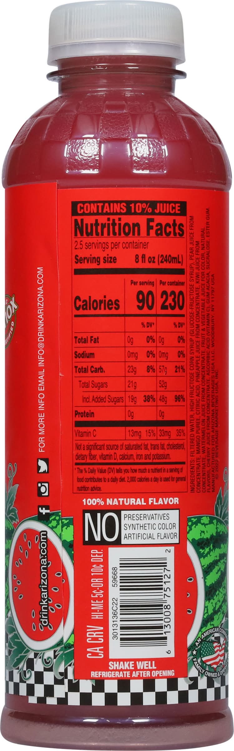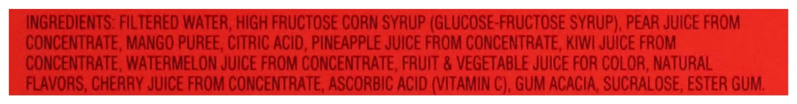 Ingredients: Filtered Water, High Fructose Corn Syrup (Glucose-Fructose Syrup), Pear Juice from Concentrate, Mango Puree, Citric Acid, Pineapple Juice from Concentrate, Kiwi Juice from Concentrate, Watermelon Juice from Concentrate, Fruit & Vegetable Juice for Color, Natural Flavors, Cherry Juice from Concentrate, Ascorbic Acid (Vitamin C), Gum Acacia, Sucralose, Ester Gum Contains: Corn