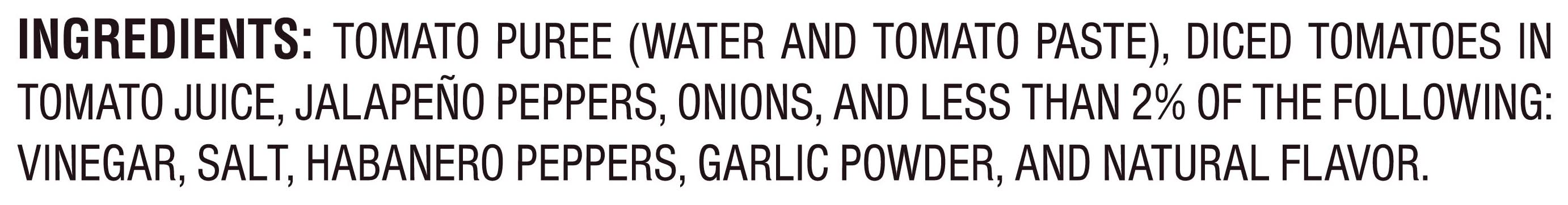 Ingredients: Tomato Puree (Water And Tomato Paste), Diced Tomatoes In Tomato Juice, Jalapeno Peppers, Onions, And Less Than 2% Of The Following: Vinegar, Salt, Habanero Peppers, Garlic Powder And Natural Flavors.