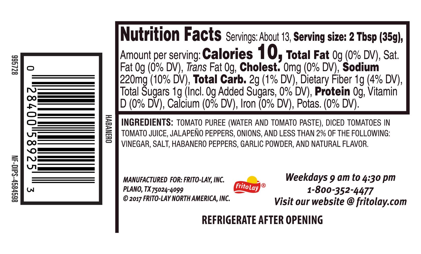 TOSTITOS tortilla chips and dips are the life of the party. Grab a jar of TOSTITOS Habanero Salsa to add some heat to your next party or get-together with friends! • Flavor: Chunky habanero hot • Frito-lay, inc., Plano,TX