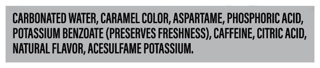 Ingredients: Carbonated Water, Caramel Color, Aspartame, Phosphoric Acid, Potassium Benzoate (Preserves Freshness), Caffeine, Citric Acid, Natural Flavor, Acesulfame Potassium Contains 59mg of caffeine