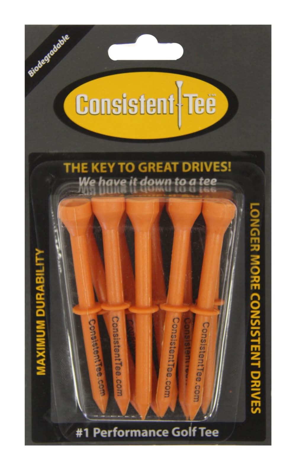 Consistent-Tee™ is designed specifically for the new oversize drivers made by major golf manufacturers. Swinging a driver is already a complex process and the last thing on your mind when teeing up should be worrying about the height of your tee. Consistent-Tee™ is designed so that your ball is always positioned for optimal launch angle and backspin. These tees are USGA compliant and will enhance the performance of your oversized driver. 3 degrees more launch angle 300 RPM's less backspin 10 yards more carry distance 15 yards more roll distance †Based on independent test results. Golf