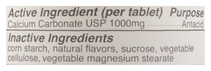 Ingredients: (Per Tablet) Active Ingredients: Calcium Carbonate USP (1000 mg), Antacid. Inactive Ingredients: Corn Starch, Natural Flavors, Sucrose, Vegetable Cellulose, Vegetable Magnesium Stearate Contains: Corn