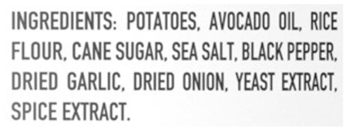 Ingredients: Potatoes, Avocado Oil, Rice Flour, Cane Sugar, Sea Salt, Black Pepper, Dried Garlic, Dried Onion, Yeast Extract, Spice Extract