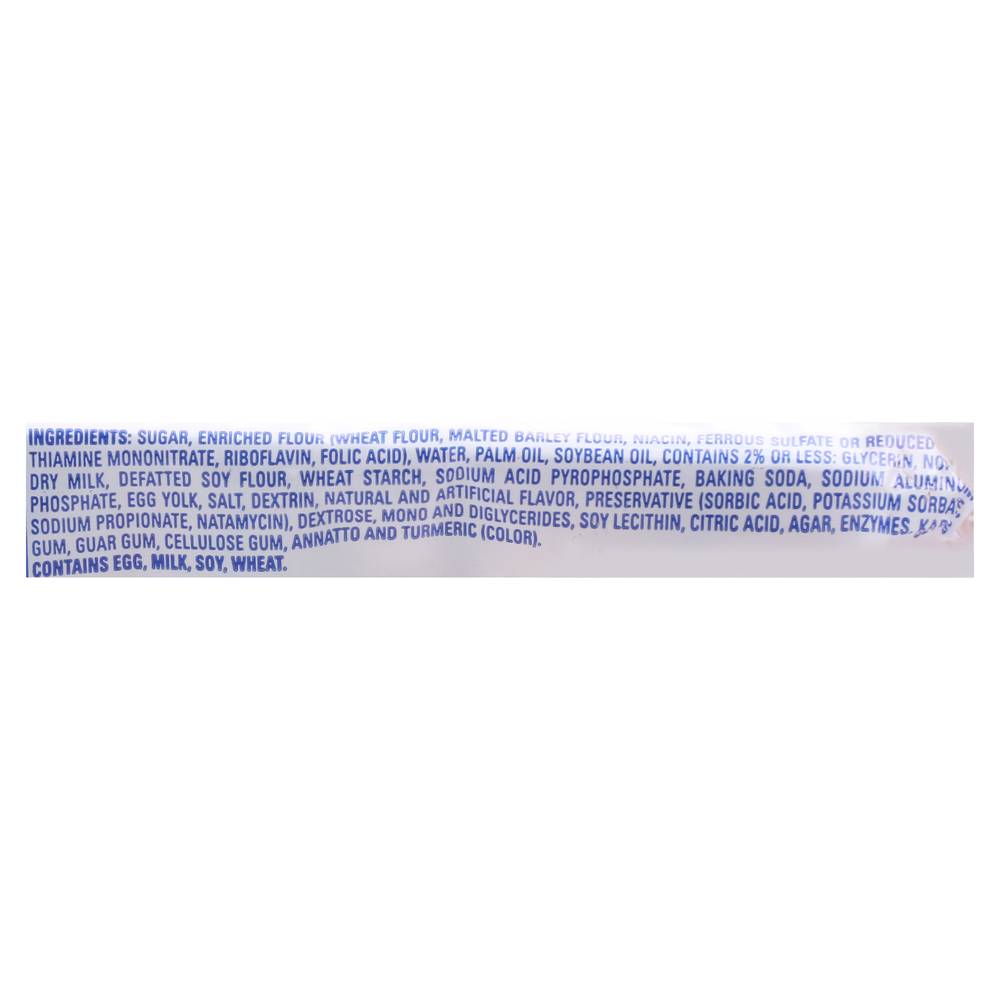 Ingredients: Sugar, Enriched Flour Wheat Flour, Malted Barley Flour, Niacin, Ferrous Sulfate or Reduced Iron, Thiamine Mononitrate, Riboflavin, Folic Acid, Water, Palm Oil, Soybean Oil, Contains 2% or Less: Glycerin, Nonfat Dry Milk, Defatted Soy Flour, Wheat Starch, Sodium Acid Pyrophosphate, Baking Soda, Sodium Aluminum Phosphate, Egg Yolk, Salt, Dextrin, Natural and Artificial Flavor, Preservative Sorbic Acid, Potassium Sorbate, Sodium Propionate, Natamycin, Dextrose, Mono and Diglycerides, Soy Lecithin, Citric Acid, Agar, Enzymes, Karaya Gum, Guar Gum, Cellulose Gum, Annatto and Turmeric Color. Contains: Eggs, milk, Soybeans, Wheat