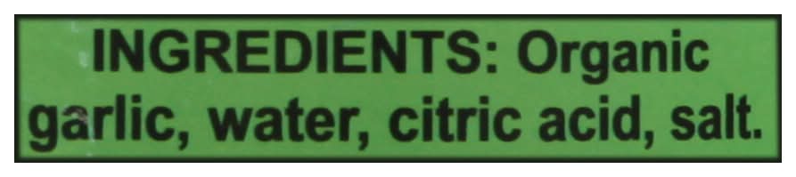 Ingredients: Organic Garlic, Water, Citric Acid, Salt Contains: 'Free From Gluten'