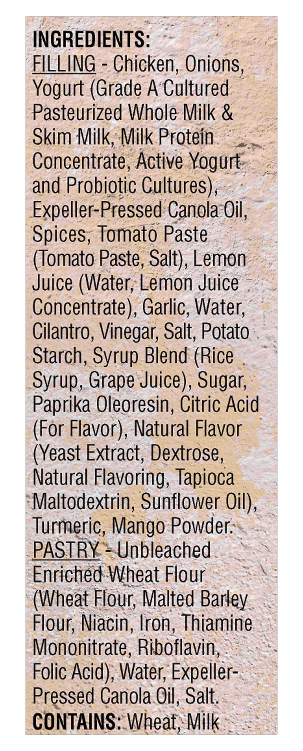Ingredients: Filling - Chicken, Onions, Yogurt (Pasteurized Cultured Grade A Milk, Nonfat Dry Milk, Milk Protein, Active Yogurt and Probiotic Cultures), Expeller-Pressed Canola Oil, Spices, Tomato Paste (Tomato Paste, Salt), Lemon Juice (Water, Lemon Juice Concentrate), Garlic, Water, Cilantro, Vinegar, Salt, Potato Starch, Syrup Blend (Rice Syrup, Grape Juice), Sugar, Paprika Oleoresin, Citric Acid (for Flavor), Natural Flavor (Yeast Extract, Dextrose, Natural Flavoring, Tapioca Maltodextrin, Sunflower Oil), Turmeric, Mango Powder, Pastry - Unbleached Enriched Wheat Flour (Wheat Flour, Malted Barley Flour, Niacin, Iron, Thiamine Mononitrate, Riboflavin, Folic Acid), Water, Expeller-Pressed Canola Oil, Salt Contains: Milk, Wheat