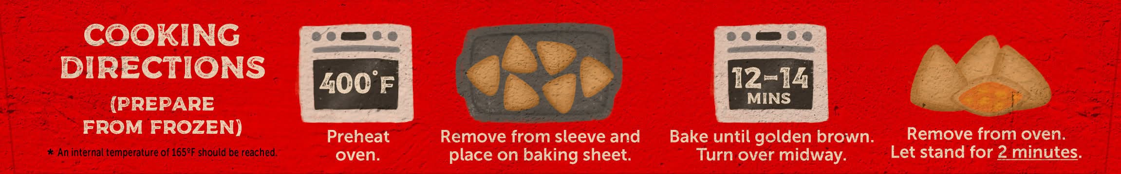 Directions for use: Cooking Directions (Prepare from frozen): 400 degrees F preheat oven. Remove from sleeve and place on baking sheet. 12-14 mins bake until golden brown. Turn over midway. Remove from oven. Let stand for 2 minutes. For a complete experience, pair with our: Chicken Tikka Masala & Garlic Naan. Keep frozen. Storage recommendation: Keep frozen.