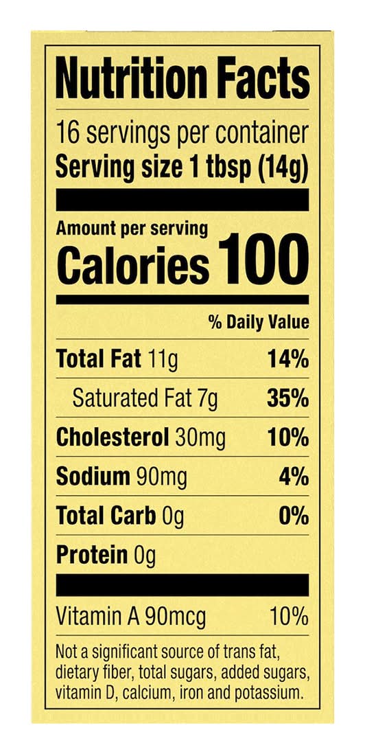 1 half stick = 1/4 cup. 100 calories per tbsp. Gluten-free. Farmer-owned. Since 1921. First quality. USDA: U.S. grade AA when graded. Packed under inspection of the U.S. Dept. of Agriculture. Officially graded