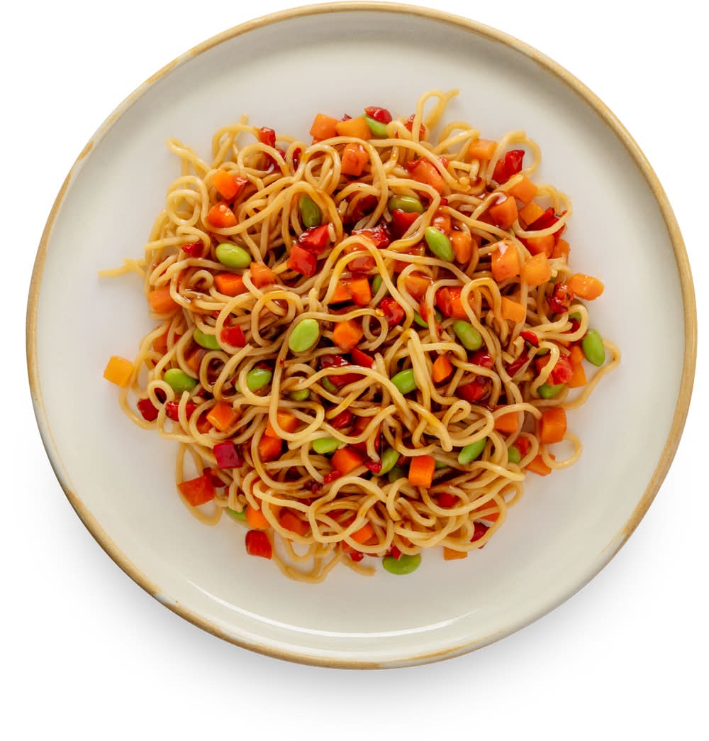 Edamame, carrots, red peppers and chow mein noodles in a rich Mongolian style sauce. Microwave Directions 1) Remove meal tray from outer packaging 2) Pierce film, microwave on high 2.5-3 minutes 3) Let stand 1 minute before removing film 4) Peel film carefully and stir, meal will be hot