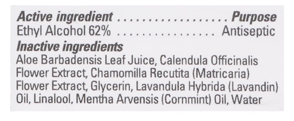 Ingredients: Active Ingredients: Ethyl Alcohol (62 %), Antiseptic. Inactive Ingredients: Aloe Barbadensis Leaf Juice, Calendula Officinalis Flower Extract, Chamomilla Recutita (Matricaria) Flower Extract, Glycerin, Lavandula Hybrida (Lavandin) Oil, Linalool, Mentha Arvensis (Cornmint) Oil, Water