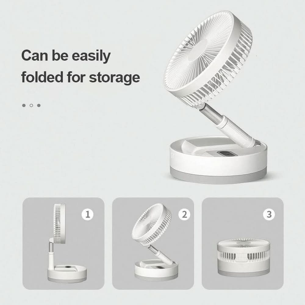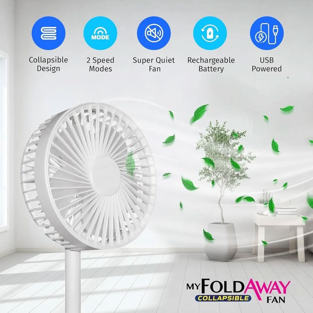 Have you ever seen a rechargeable, portable fan powerful enough to cool you from across the room before. My Foldaway Fan is the best fan you'll ever own because it WORKS. My Foldaway Fan has an adjustable height capability, from being a tabletop fan to a standing fan in seconds. It is ultra-lightweight and portable and extremely easy to store. 4 AA Batteries or USB powered. • Color: White • Size: 12 in