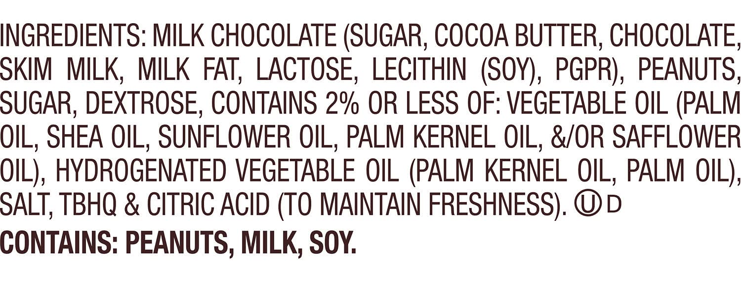Ingredients: MILK CHOCOLATE, SUGAR, COCOA BUTTER, CHOCOLATE, SKIM MILK, MILK FAT, LACTOSE, LECITHIN (SOY), PGPR, PEANUTS, SUGAR, DEXTROSE, CONTAINS 2% OR LESS OF: VEGETABLE OIL (PALM OIL, SHEA OIL, SUNFLOWER OIL, PALM KERNEL OIL, /OR SAFFLOWER OIL), HYDROGENATED VEGETABLE OIL (PALM KERNEL OIL, PALM OIL), SALT, TBHQ CITRIC ACID (TO MAINTAIN FRESHNESS), . Contains: Contains: Peanuts|Soy|Milk
