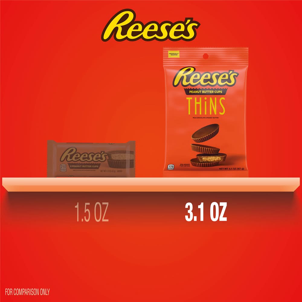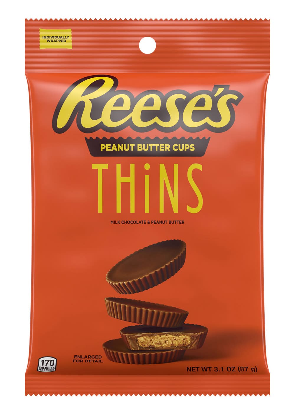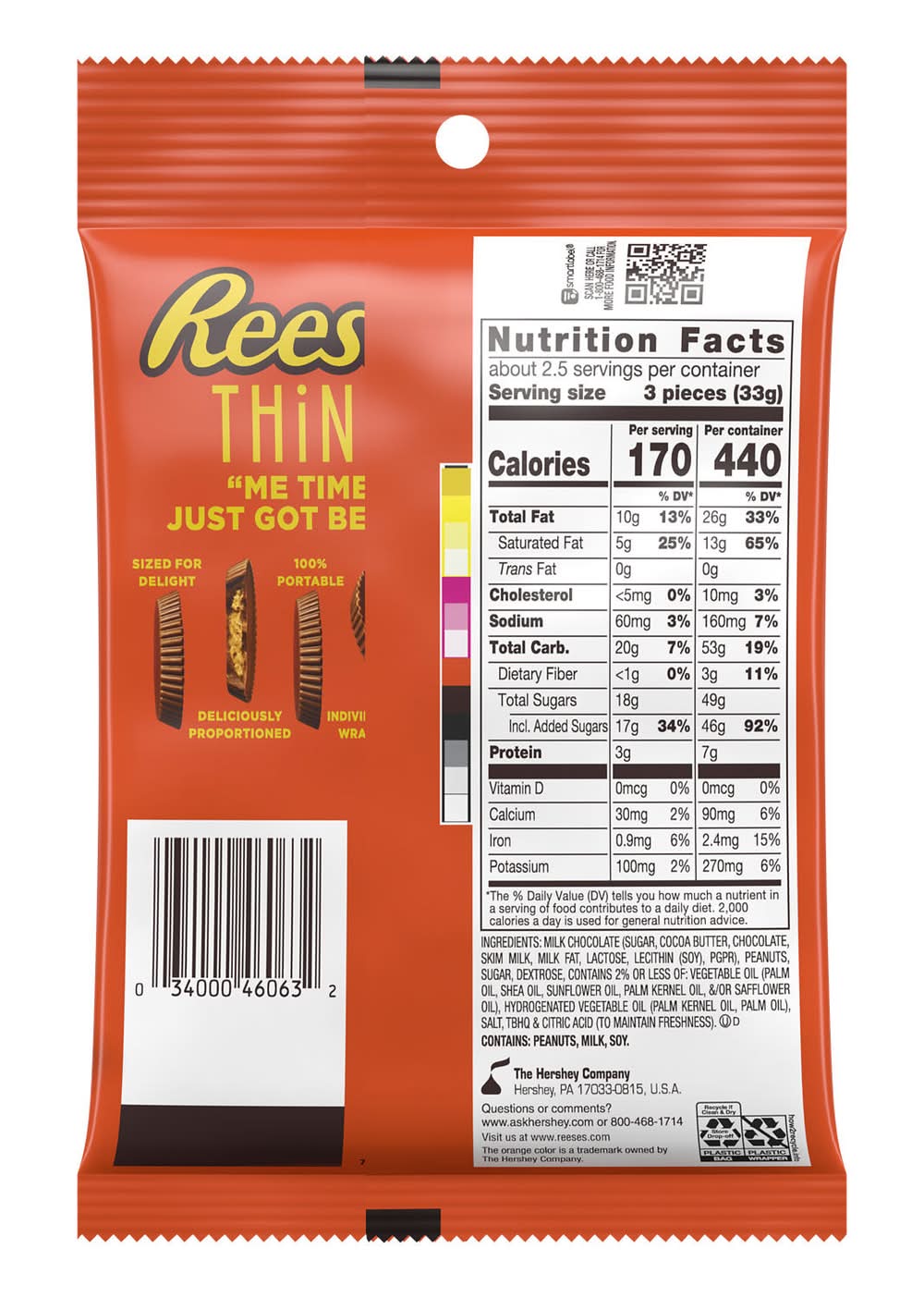 No, your eyes aren't playing tricks on you: REESE'S THiNS candy really is that thin! Indulge in the sweet combination of milk chocolate and peanut butter with these deliciously proportioned candies. REESE'S THiNS milk chocolate peanut butter cups are perfectly sized for sharing and snacking. Keep a bag on hand for a bite of something sweet if you need an afternoon pick-me-up or want an easy, on-the-go snack. Ready to kick your movie night up a notch? Share a bag of these individually wrapped candies to keep everyone happily snacking throughout the film. Keep your office breakroom, home candy bowls and kitchen pantry stocked with delectable kosher certified treats featuring smooth milk chocolate and sweet peanut butter. Whether you need a Christmas stocking stuffer, Halloween trick-or-treat candy, Easter basket filler, Valentine's Day present or a sweet peanut butter treat to help you unwind, REESE'S THiNS peanut butter cups candies have you covered. Even your best-baked goods will stand out with these thin peanut butter cups. Make mini ice cream sandwiches, bake them inside your favorite cookie dough or put them in the freezer for a refreshing snack. Share them with friends and family, just don't forget to save some for yourself! • Number of servings: 2 • Hershey, Hershey, PA, 17033-0815, Ph: 800-468-1714