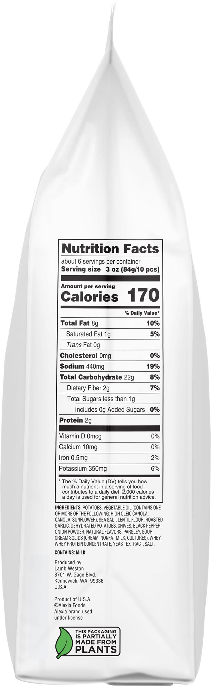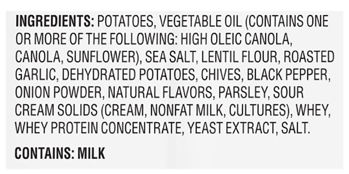 Ingredients: Potatoes, Vegetable Oil (Contains One or More of the Following: High Oleic Canola, Canola, Sunflower), Sea Salt, Lentil Flour, Roasted Garlic, Dehydrated Potatoes, Chives, Black Pepper, Onion Powder, Natural Flavors, Parsley, Sour Cream Solids (Cream, Nonfat Milk, Cultures), Whey, Whey Protein Concentrate, Yeast Extract, Salt Contains: Milk