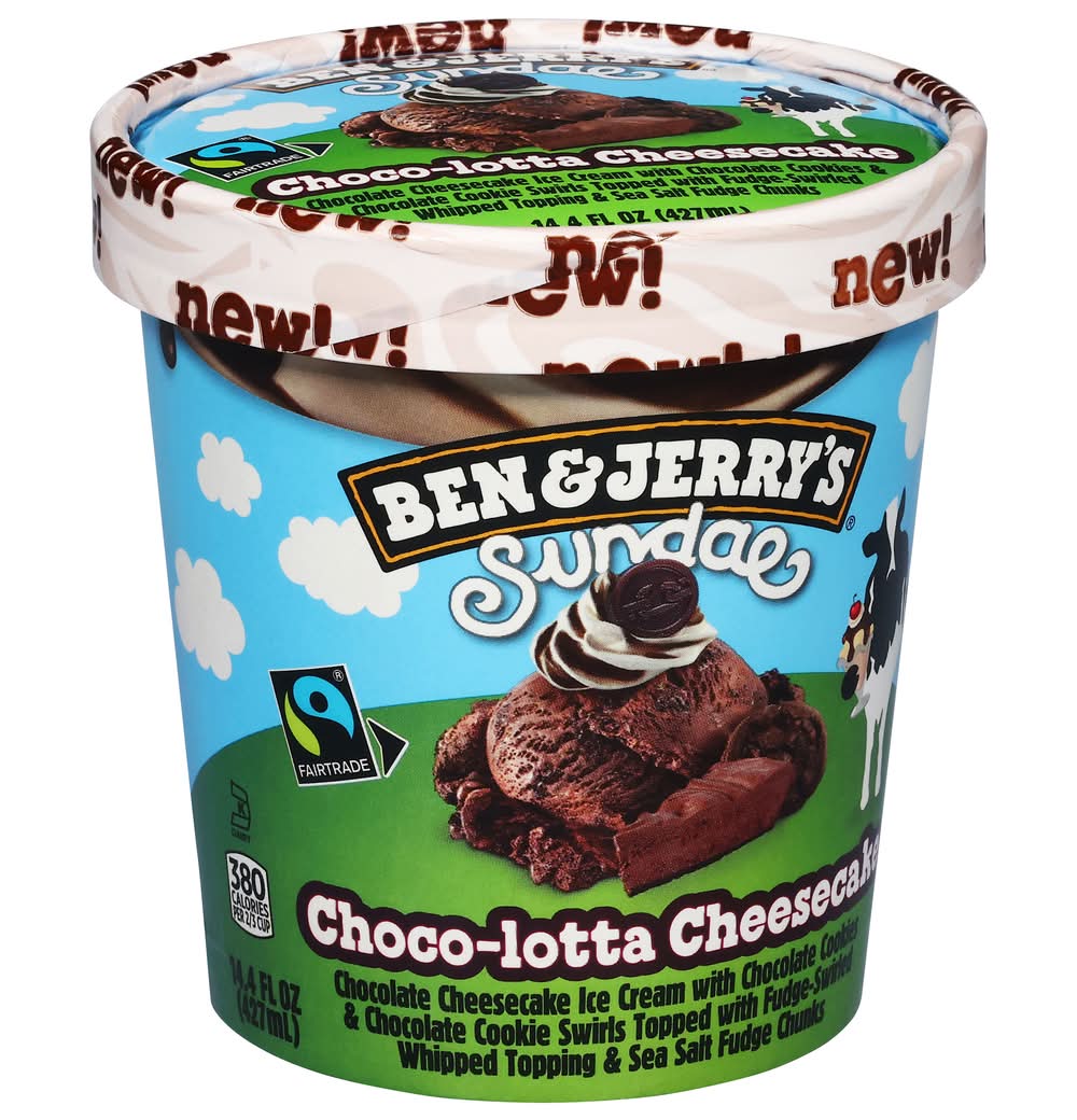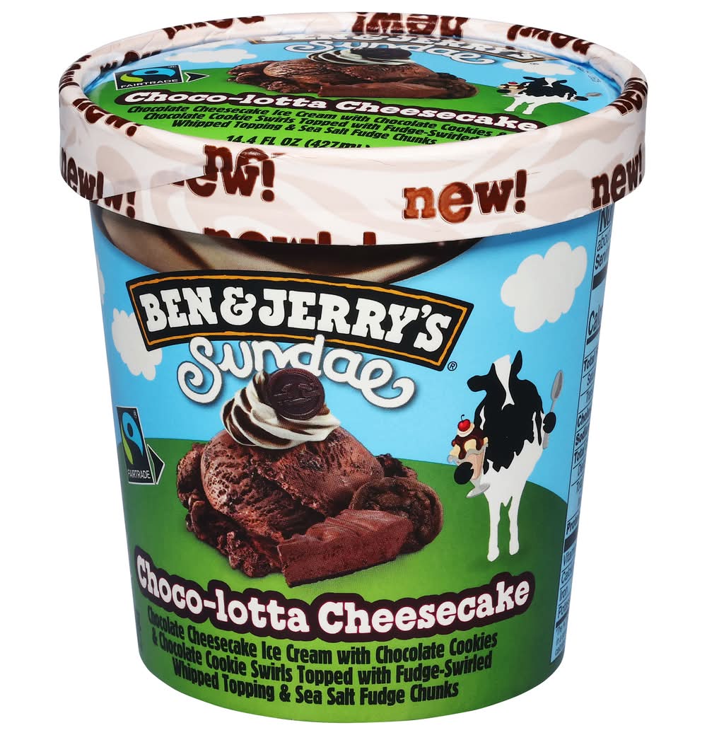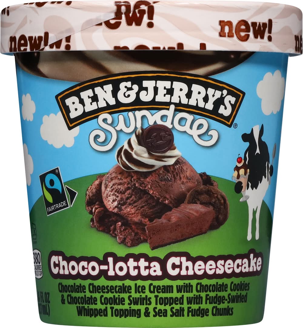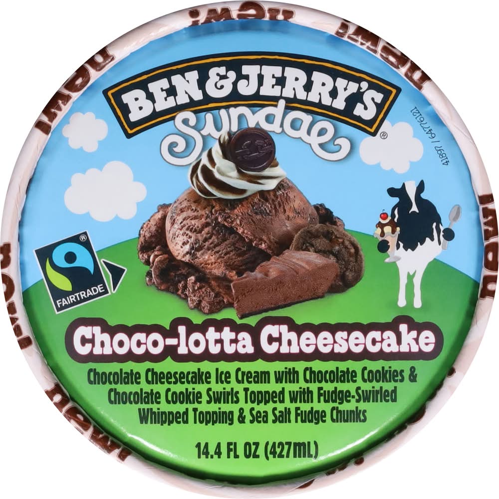 Chocolate Cookie swirls, topped with fudge swirled whipped topping and sea salt fudge chunks We recommend diving spoon-deep into this cookie-thrilling, cheesecake-dreamy & fudge swirl-spectacular Ben & Jerry's Chocolatta Cheesecake sundae. It's the best way to achieve ice cream nirvana If chocolate cheesecake is the name of your game, this all-in-one sundae-in-a-pint is about to be your next favorite dessert! Craving an ice cream sundae but don't have all the ingredients at the ready We've got you covered! Sundae pints have all the chunks and swirls of a classic Ben & Jerry's ice cream flavor, plus a soft whipped topping with — you guessed it — even more chunks and swirls. Choco-lotta Cheesecake Sundae has all the decadence of a chocolate sundae with a cheesecake twist that's a whole choco-lotta fun. Grab your favorite ice cream spoon and be thankful that you don't have to make the impossible choice between chocolate cheesecake and an ice cream sundae. Even better: Grab two ice cream spoons and share this decadent treat with your favorite chocolate cheesecake lover! Ben & Jerry's Choco-lotta Cheesecake Sundae has something even more exciting under the lid: It's made with non-GMO sourced ingredients, including Fairtrade certified cocoa, sugar, and vanilla, plus eggs from cage-free hens. Now that's a treat you can really feel good about! Flavor: Chocolotta cheesecake