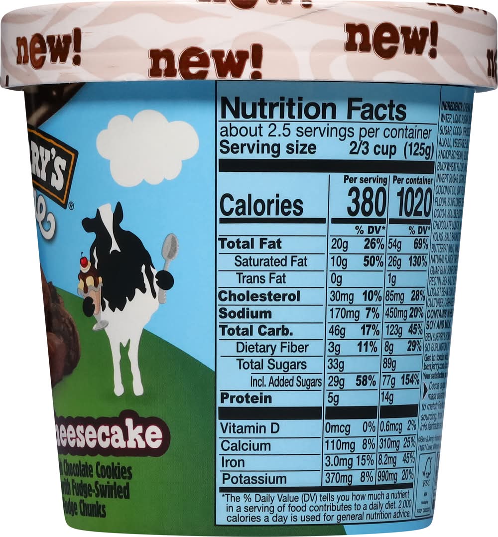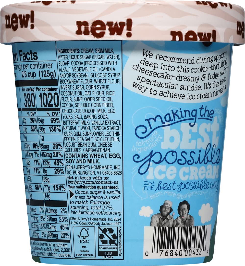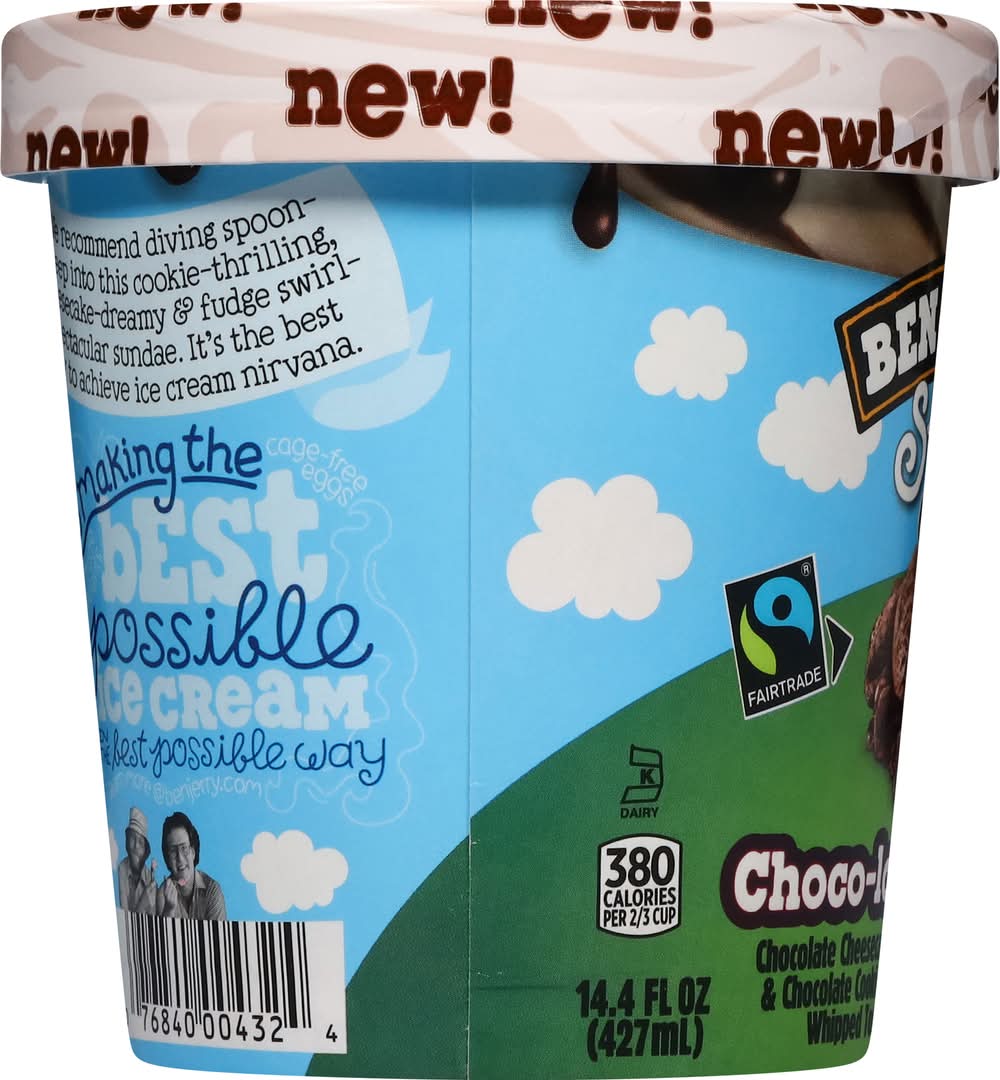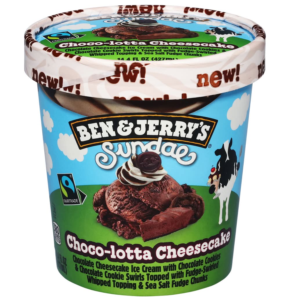 Chocolate Cookie swirls, topped with fudge swirled whipped topping and sea salt fudge chunks We recommend diving spoon-deep into this cookie-thrilling, cheesecake-dreamy & fudge swirl-spectacular Ben & Jerry's Chocolatta Cheesecake sundae. It's the best way to achieve ice cream nirvana If chocolate cheesecake is the name of your game, this all-in-one sundae-in-a-pint is about to be your next favorite dessert! Craving an ice cream sundae but don't have all the ingredients at the ready We've got you covered! Sundae pints have all the chunks and swirls of a classic Ben & Jerry's ice cream flavor, plus a soft whipped topping with — you guessed it — even more chunks and swirls. Choco-lotta Cheesecake Sundae has all the decadence of a chocolate sundae with a cheesecake twist that's a whole choco-lotta fun. Grab your favorite ice cream spoon and be thankful that you don't have to make the impossible choice between chocolate cheesecake and an ice cream sundae. Even better: Grab two ice cream spoons and share this decadent treat with your favorite chocolate cheesecake lover! Ben & Jerry's Choco-lotta Cheesecake Sundae has something even more exciting under the lid: It's made with non-GMO sourced ingredients, including Fairtrade certified cocoa, sugar, and vanilla, plus eggs from cage-free hens. Now that's a treat you can really feel good about! Flavor: Chocolotta cheesecake