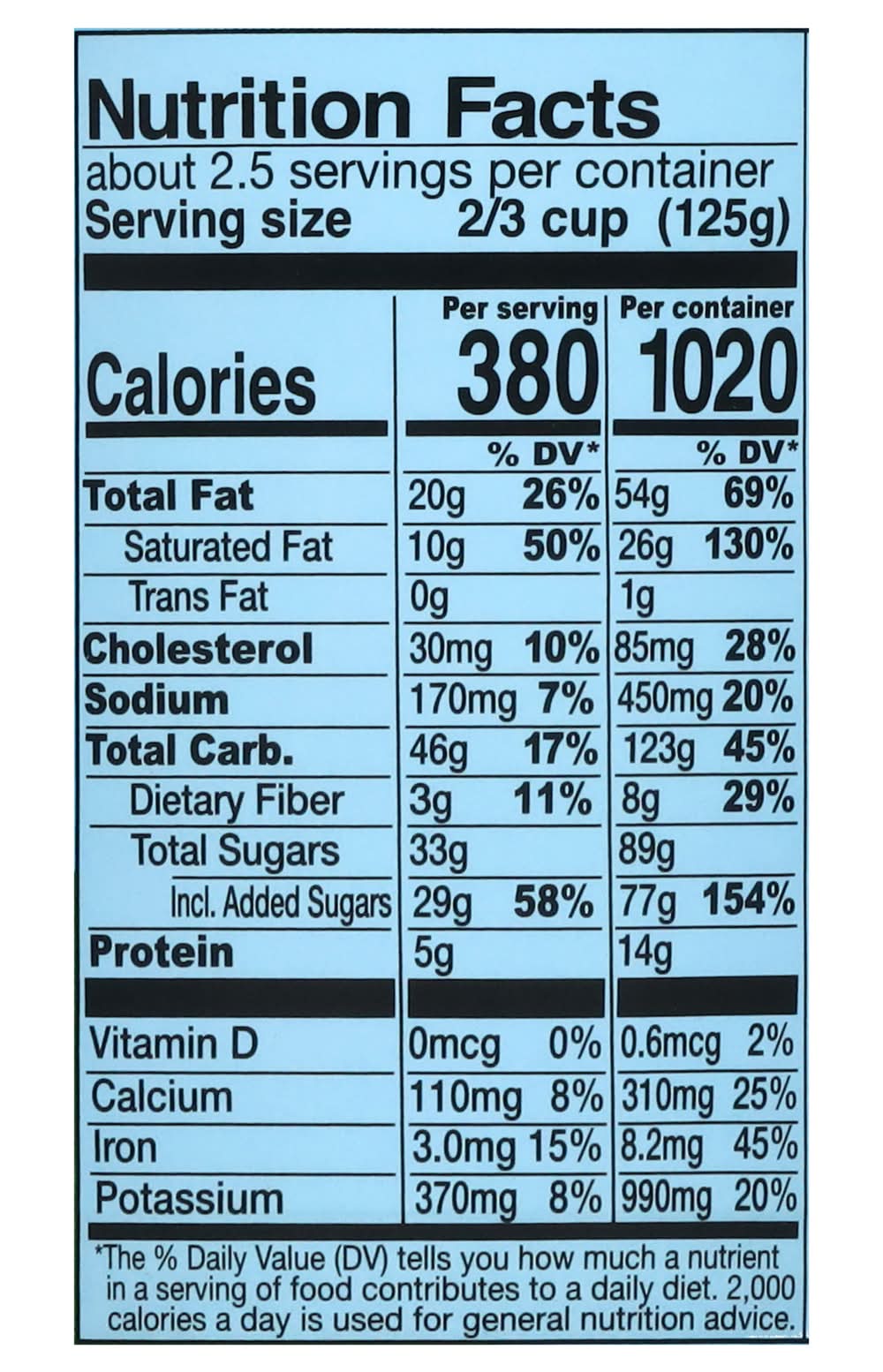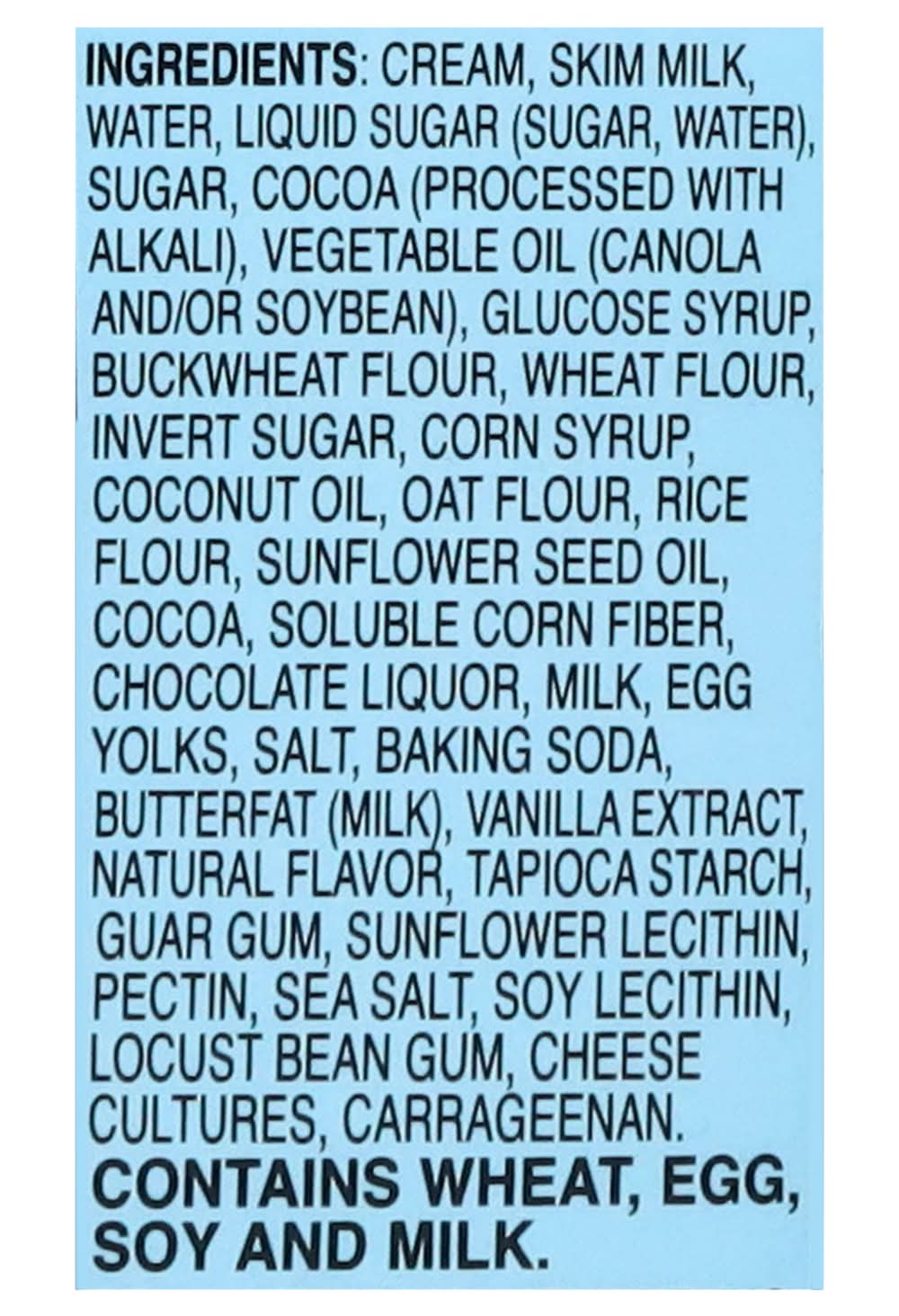 Ingredients: Cream, Skim Milk, Water, Liquid Sugar (Sugar, Water), Sugar, Cocoa (Processed with Alkali), Vegetable Oil (Canola and/or Soybean), Glucose Syrup, Buckwheat Flour, Wheat Flour, Invert Sugar, Corn Syrup, Coconut Oil, Oat Flour, Rice Flour, Sunflower Seed Oil, Cocoa, Soluble Corn Fiber, Chocolate Liquor, Milk, Egg Yolks, Salt, Baking Soda, Butterfat (Milk), Vanilla Extract, Natural Flavor, Tapioca Starch, Guar Gum, Sunflower Lecithin, Pectin, Sea Salt, Soy Lecithin, Locust Bean Gum, Cheese Cultures, Carrageenan Contains: Dairy, Eggs, Lactose, Milk, Soy, Wheat