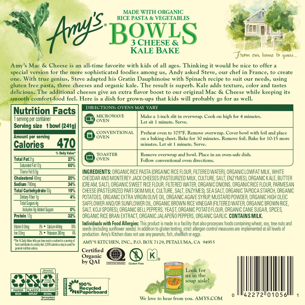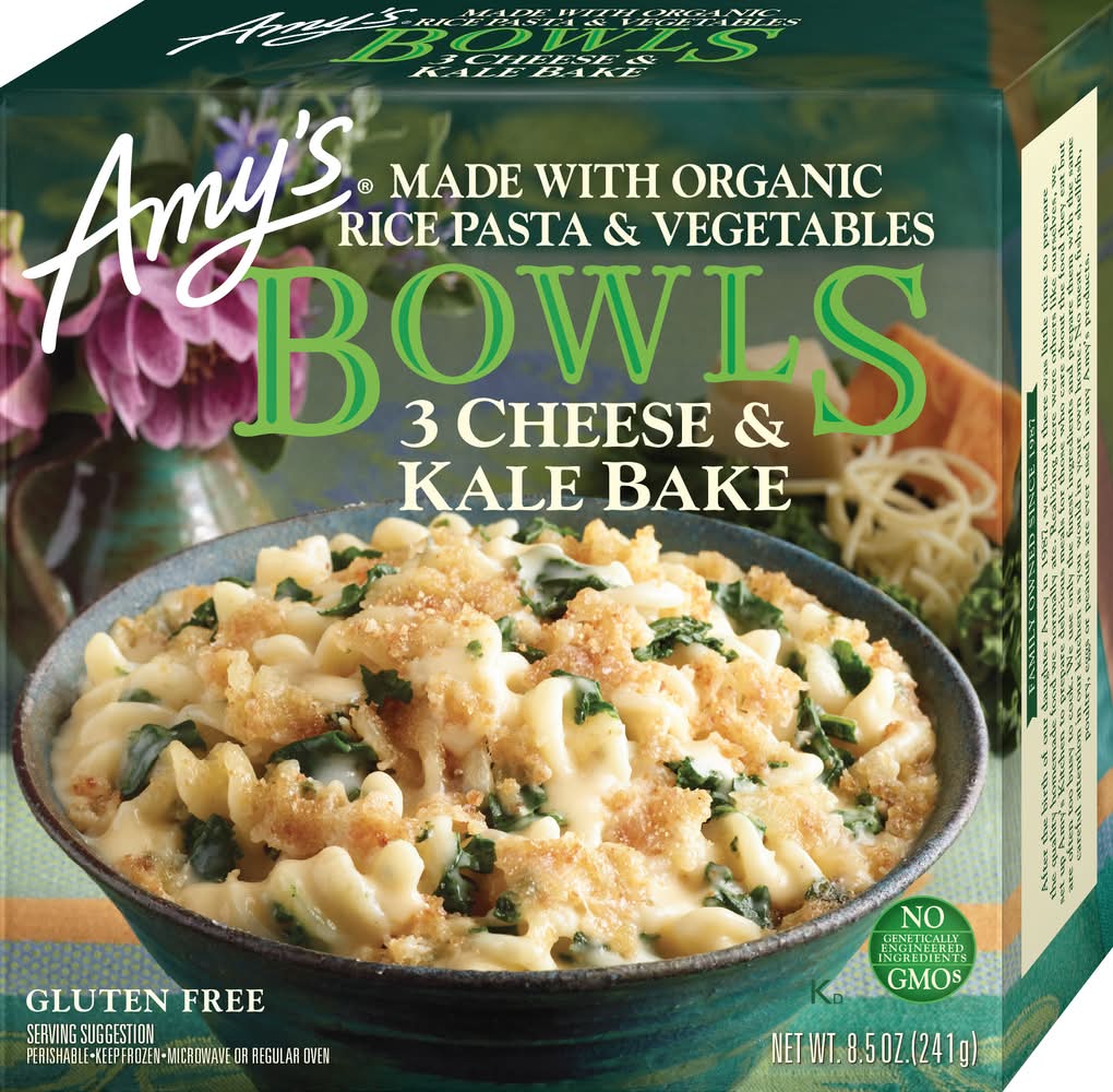 Three Cheese Kale Bake Bowl • Flavor: 3 cheese & kale bake • Amy's kitchen, inc., PO Box 7129,Petaluma,CA,94955 • Packaging: Reusable