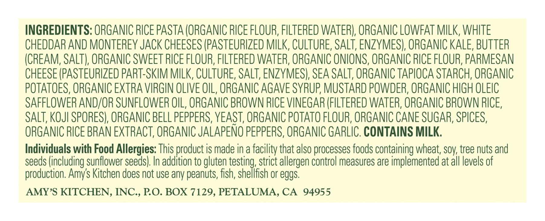 Ingredients: Organic Rice Pasta (Organic Rice Flour Filtered Water), Organic Lowfat Milk, White Cheddar and Monterey Jack Cheeses (Pasteurized Milk Culture Salt Enzymes), Organic Kale, Butter (Cream Salt), Organic Sweet Rice Flour, Filtered Water, Organic Onions, Organic Rice Flour, Parmesan Cheese (Pasteurized Part-Skim Milk Culture Salt Enzymes), Sea Salt, Organic Tapioca Starch, Organic Potatoes, Organic Extra Virgin Olive Oil, Organic Agave Syrup, Mustard Powder, Organic High Oleic Safflower and/or Sunflower Oil, Organic Brown Rice Vinegar (Filtered Water Organic Brown Rice Salt Koji Spores), Organic Bell Peppers, Yeast, Organic Potato Flour, Organic Cane Sugar, Spices, Organic Rice Bran Extract, Organic Jalapeno Peppers, Organic Garlic Contains: Milk, Mustard, Wheat, Soybeans, Tree Nuts
