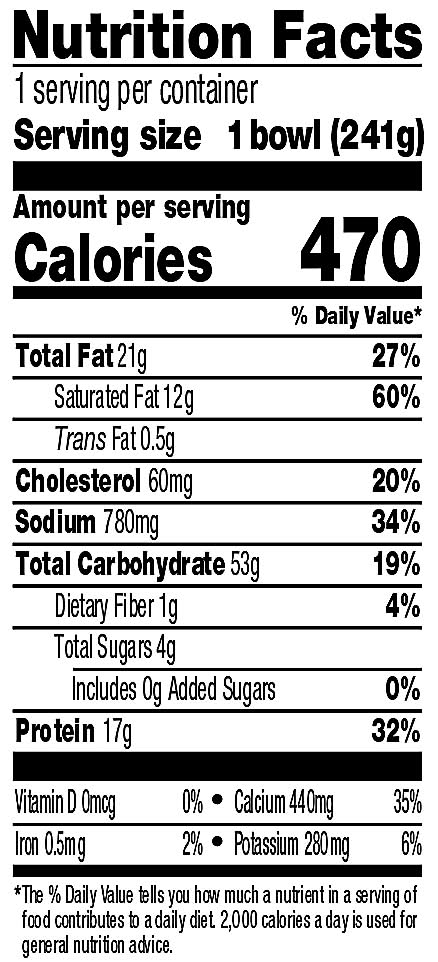 Directions for use: Directions: Ovens may vary. Microwave Oven: Make a 1-inch slit in overwrap. Cook on high for 4 minutes. Let sit 1 minute. Serve. Conventional Oven: Preheat oven to 375 degrees F. Remove overwrap. Cover bowl with foil and place on a baking sheet. Bake for 30 minutes. Remove foil. Bake for 10-15 more minutes. Let sit 1 minute. Serve. Toaster Oven: Remove overwrap and bowl. Place in an oven-safe dish. Follow conventional oven directions. Perishable. Keep frozen. Storage recommendation: Perishable. Keep frozen.