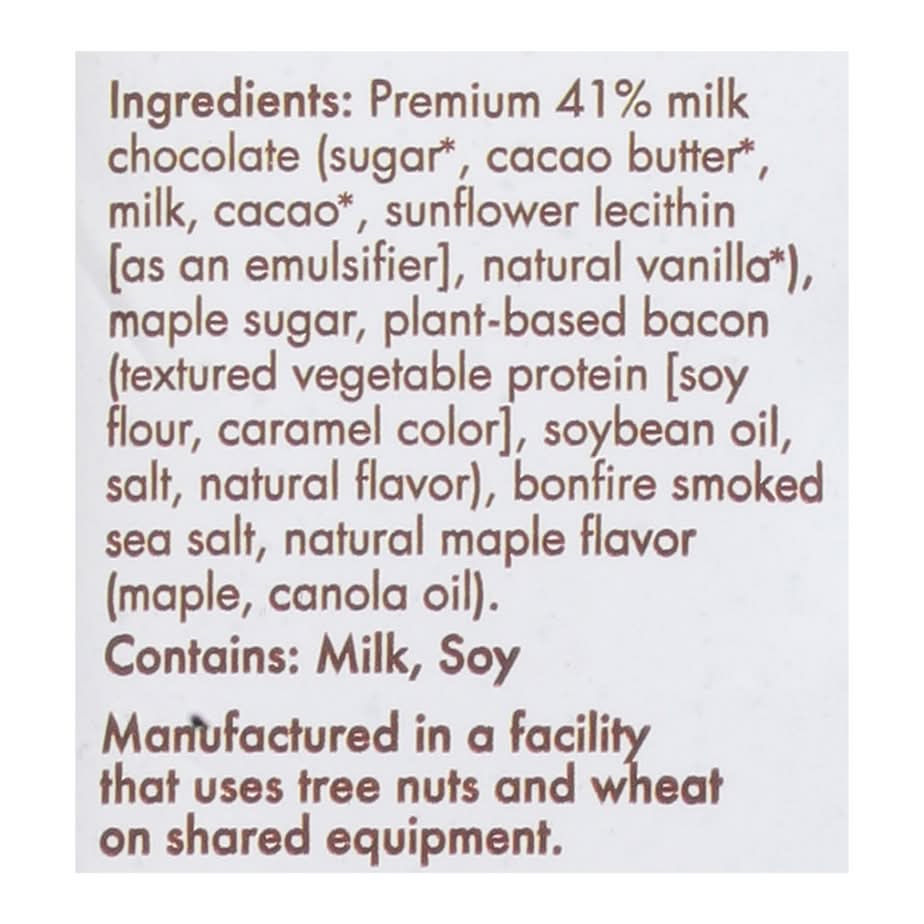 Ingredients: Premium 41% Milk Chocolate (Sugar (67% Fair Trade Certified by Fair Trade USA), Cacao Butter (67% Fair Trade Certified by Fair Trade USA), Milk, Cacao (67% Fair Trade Certified by Fair Trade USA), Sunflower Lecithin [as an Emulsifier], Natural Vanilla), Maple Sugar, Plant-Based Bacon (Textured Vegetable Protein [Soy Flour, Caramel Color], Soybean Oil, Salt, Natural Flavor), Bonfire Smoked Sea Salt, Natural Maple Flavor (Maple, Canola Oil) Contains: Milk, Soybeans, Tree Nuts, Wheat