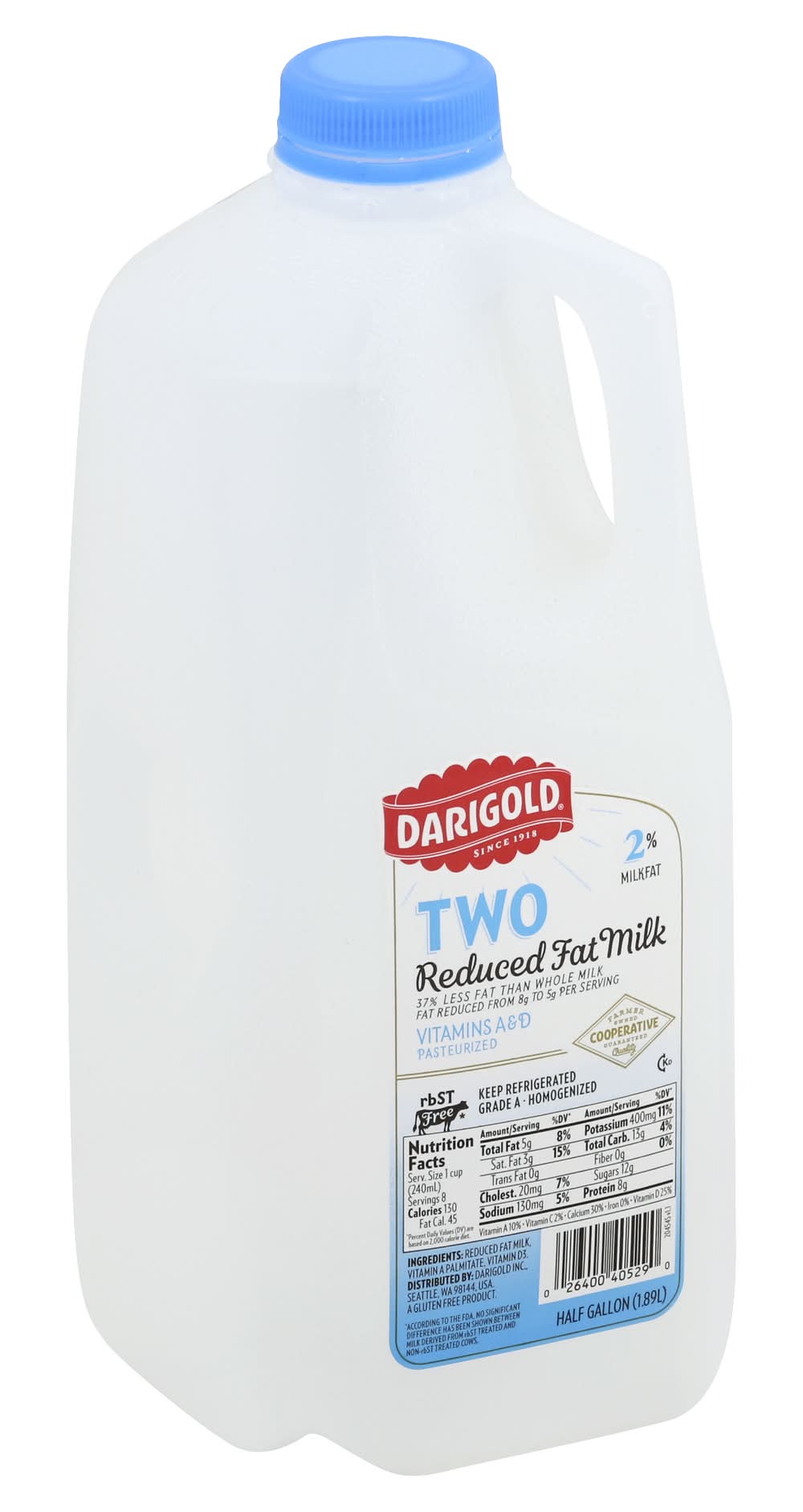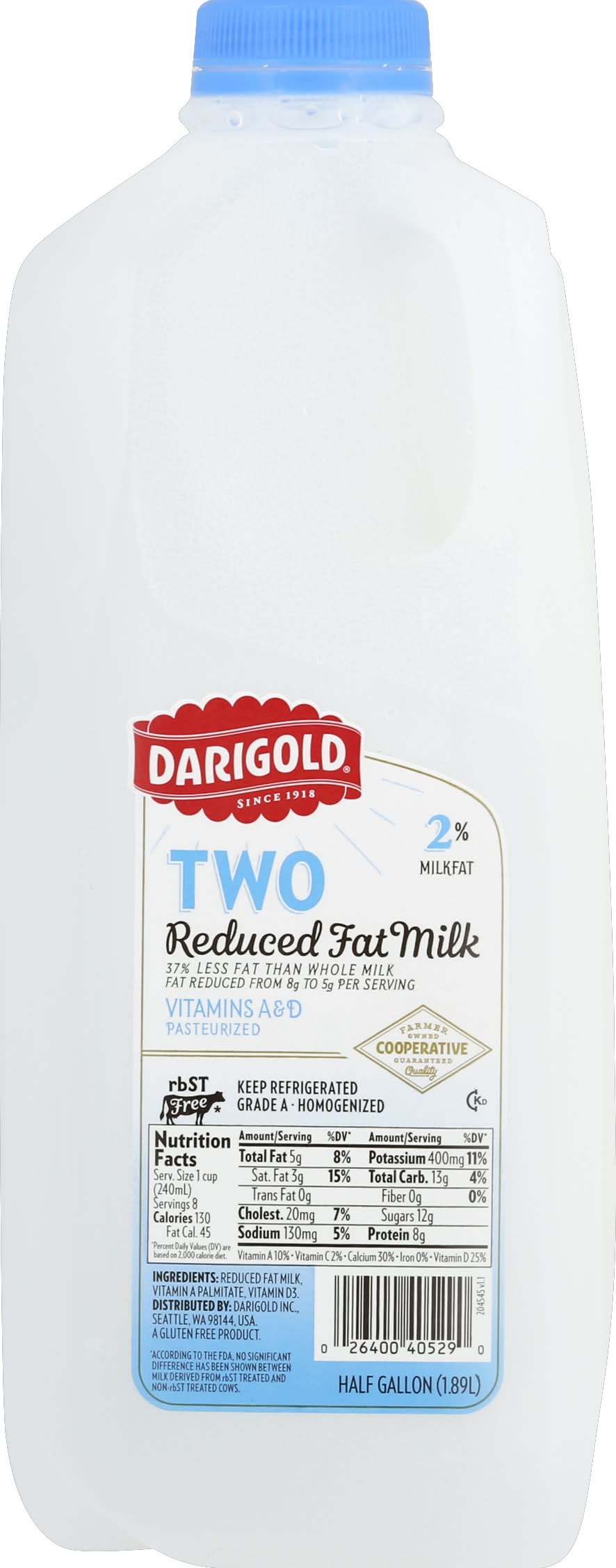 A gluten free product. 37% less fat than whole milk. Fat reduced from 8 g to 5 g per serving. Pasteurized. rbST free (According to the FDA, no significant difference has been shown between milk derived from rbST treated and non-rbST treated cows). Vitamins A & D. Grade A. Homogenized. Since 1918. Farmer owned cooperative guaranteed quality. Packaging: Reusable
