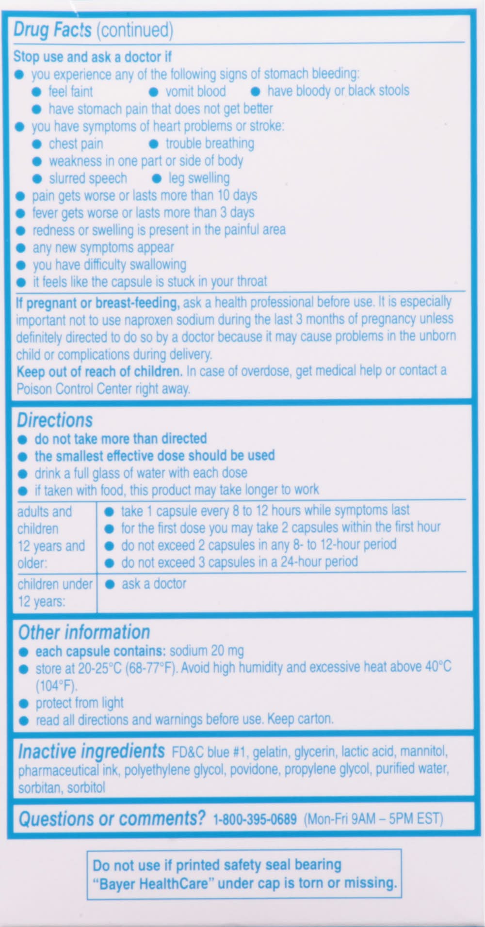 Ingredients: In Each Capsule Active Ingredients: *Naproxen Sodium (Naproxen 200 mg) (NSAID) (220 mg), Pain Reliever/Fever Reducer. Inactive Ingredients: FD&C Blue 1, Gelatin, Glycerin, Lactic Acid, Mannitol, Pharmaceutical Ink, Polyethylene Glycol, Povidone, Propylene Glycol, Purified Water, sorbitan, Sorbitol Additives: FD&C Blue 1, Gelatin, Glycerin, Lactic Acid, Mannitol, Pharmaceutical Ink, Polyethylene Glycol, Povidone, Propylene Glycol, Purified Water, sorbitan, Sorbitol.