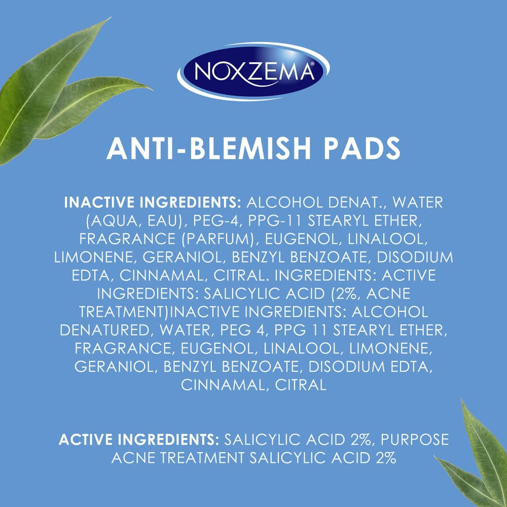 Use Noxzema Ultimate Clear Anti-Blemish Face Pads for smooth, soft, refreshed skin. These anti-blemish pads are made with salicylic acid to help clear pores, treat acne, and prevent future breakouts. Salicylic acid treats current breakouts and helps to prevent future breakouts to leave you with soft, clear skin. Use these face pads as part of your skincare routine to leave your skin less susceptible to breakouts. While the salicylic acid treats acne, the eucalyptus oil and menthol add that signature Noxzema tingle. Noxzema Ultimate Clear Anti-Blemish Face Pads are dermatologist tested to remove excess oil and other impurities to leave your skin clean, fresh, and less susceptible to blemishes. How to Use: Clean the skin thoroughly before applying this product. Cover the entire affected area with a thin layer one to three times daily. Because excessive drying of the skin may occur, start with one application daily, then gradually increase to two or three times daily if needed or as directed by a doctor. If bothersome dryness or peeling occurs, reduce application to once a day or even every other day. Avoid contact with eyes. If contact occurs, rinse thoroughly with water. Experience the Noxzema difference with products—such as our original cleansing cream, deep pore cleanser, and anti-blemish face scrub—that give your skin an invigorating fresh start and visibly clearer skin. Put your trust in a classic and get ready for refreshingly clean skin. Size: 2.25 in