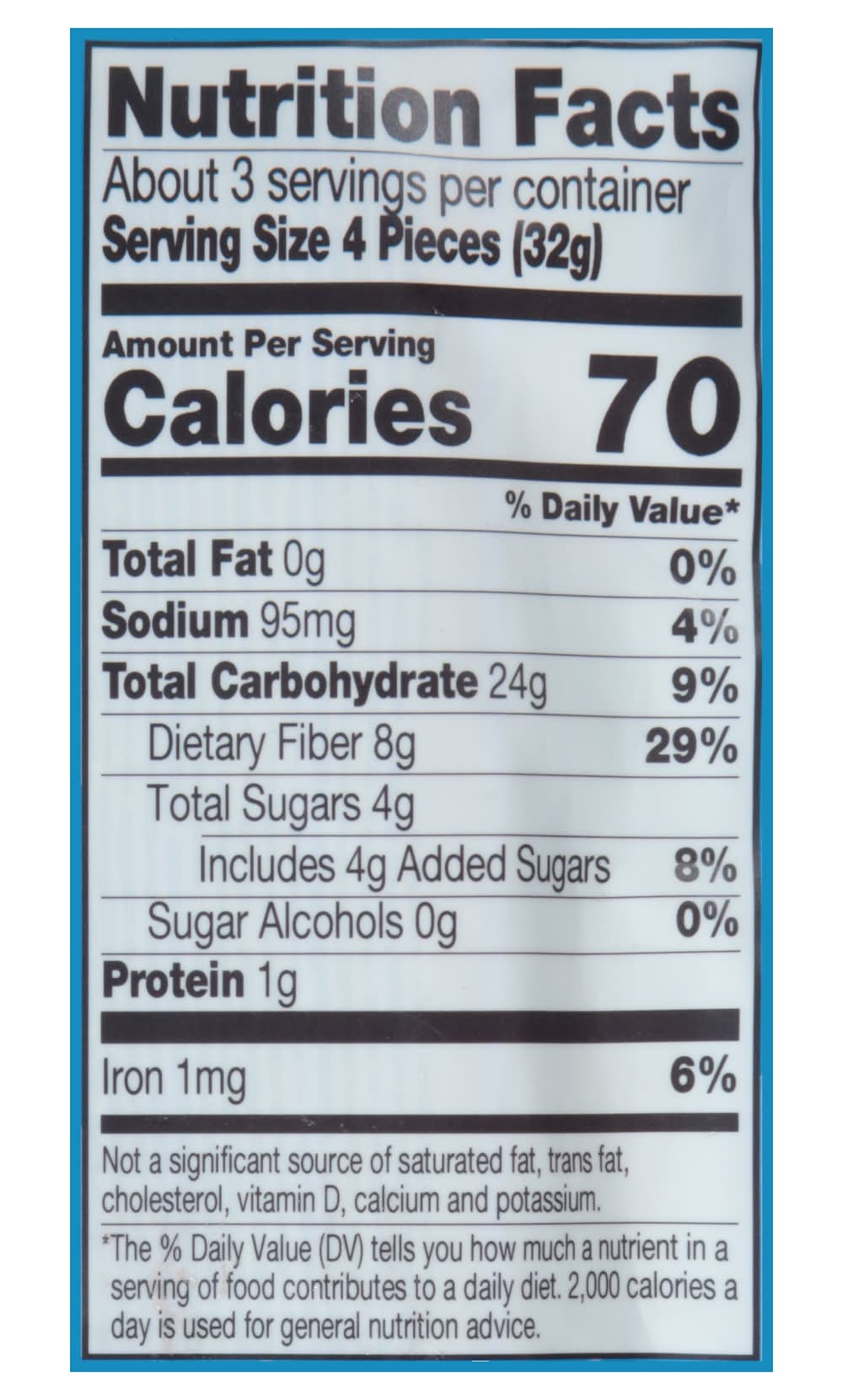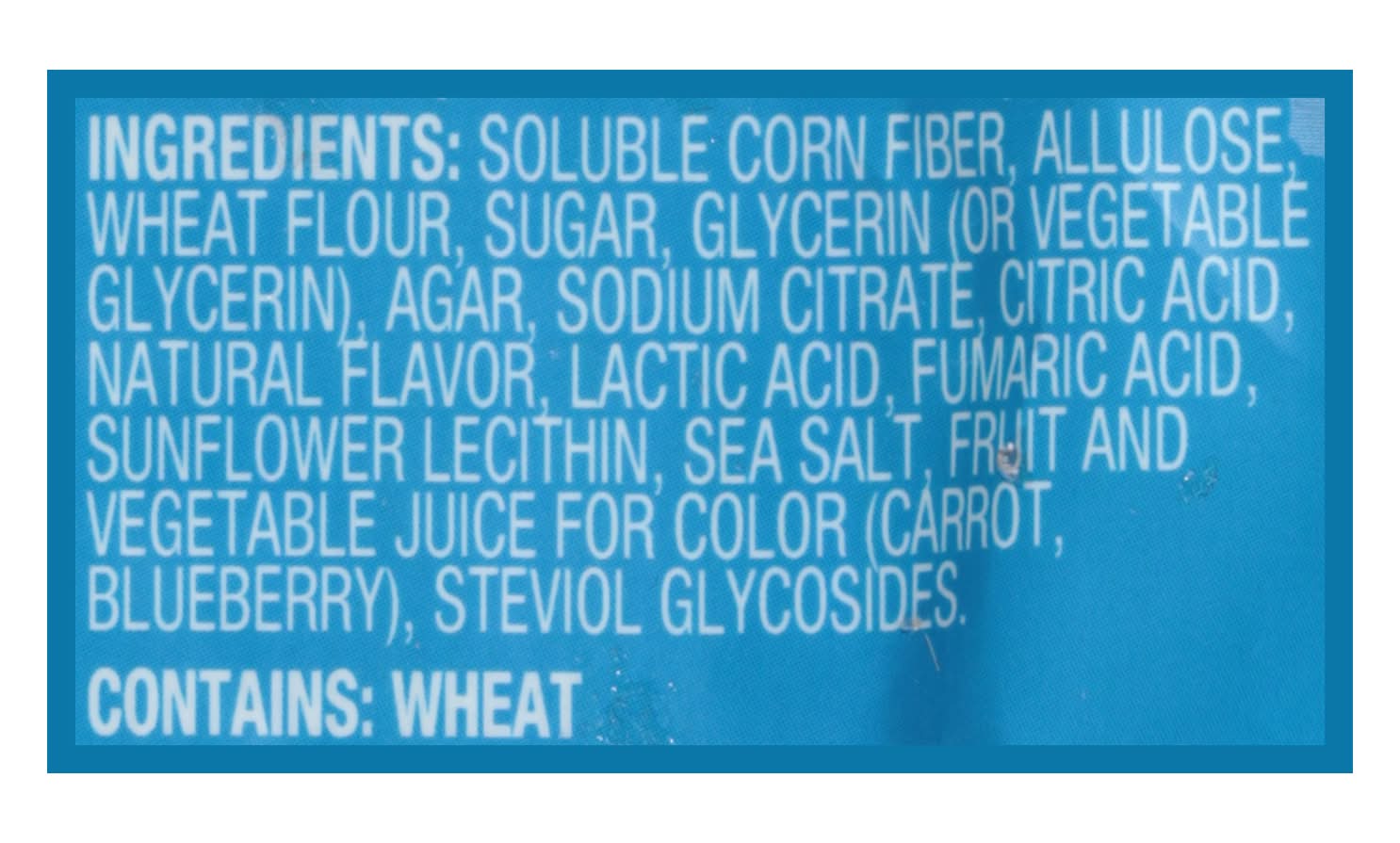 Ingredients: Soluble Corn Fiber, Allulose Wheat Flour, Sugar, Glycerin (or Vegetable Glycerin), Agar, Sodium Citrate, Citric Acid, Natural Flavor, Lactic Acid, Fumaric Acid, Sunflower Lecithin, Sea Salt, Fruit and Vegetable Juice for Color (Carrot, Blueberry), Steviol Glycosides Contains: Wheat, Corn, Milk, Peanuts, Soybeans, Wheat
