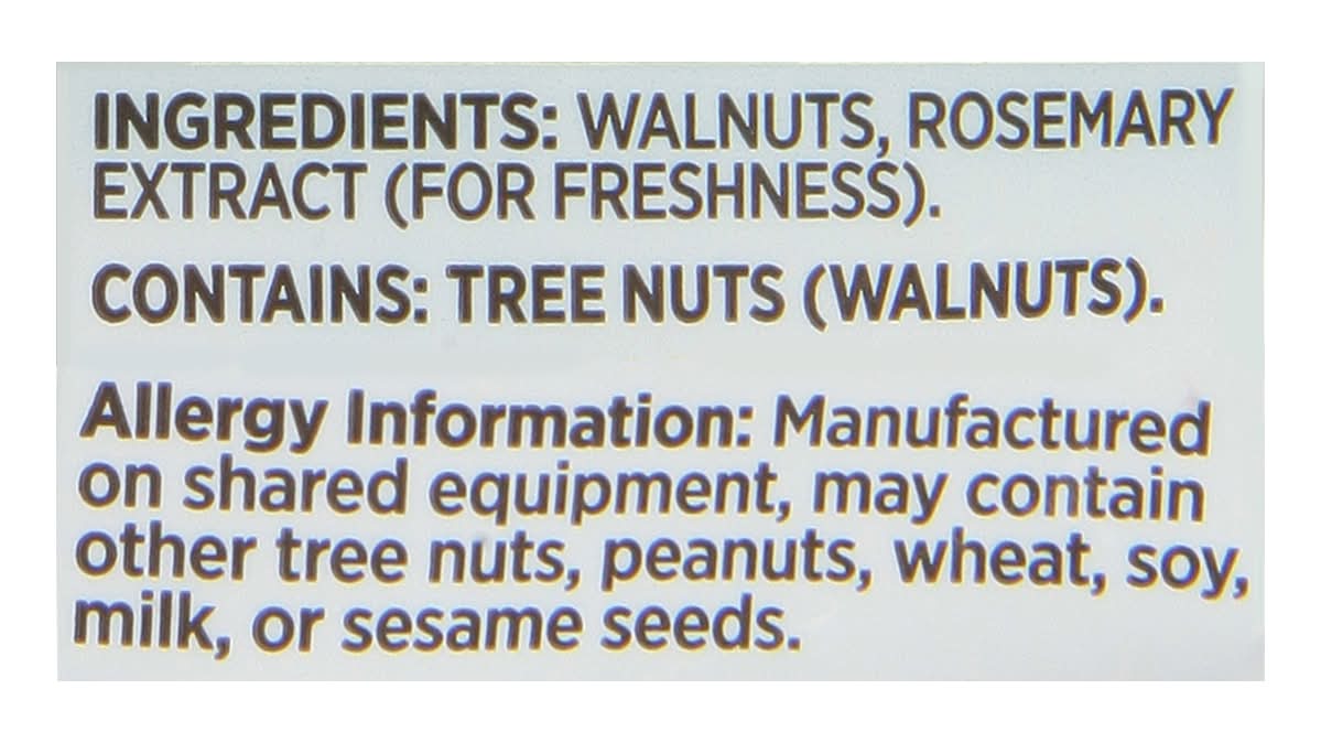 Ingredients: Walnuts, Rosemary Extract (for Freshness) Contains: Tree Nuts, Walnuts/Butternuts, Tree Nuts, Peanuts, Wheat, Soybeans, Milk, Sesame