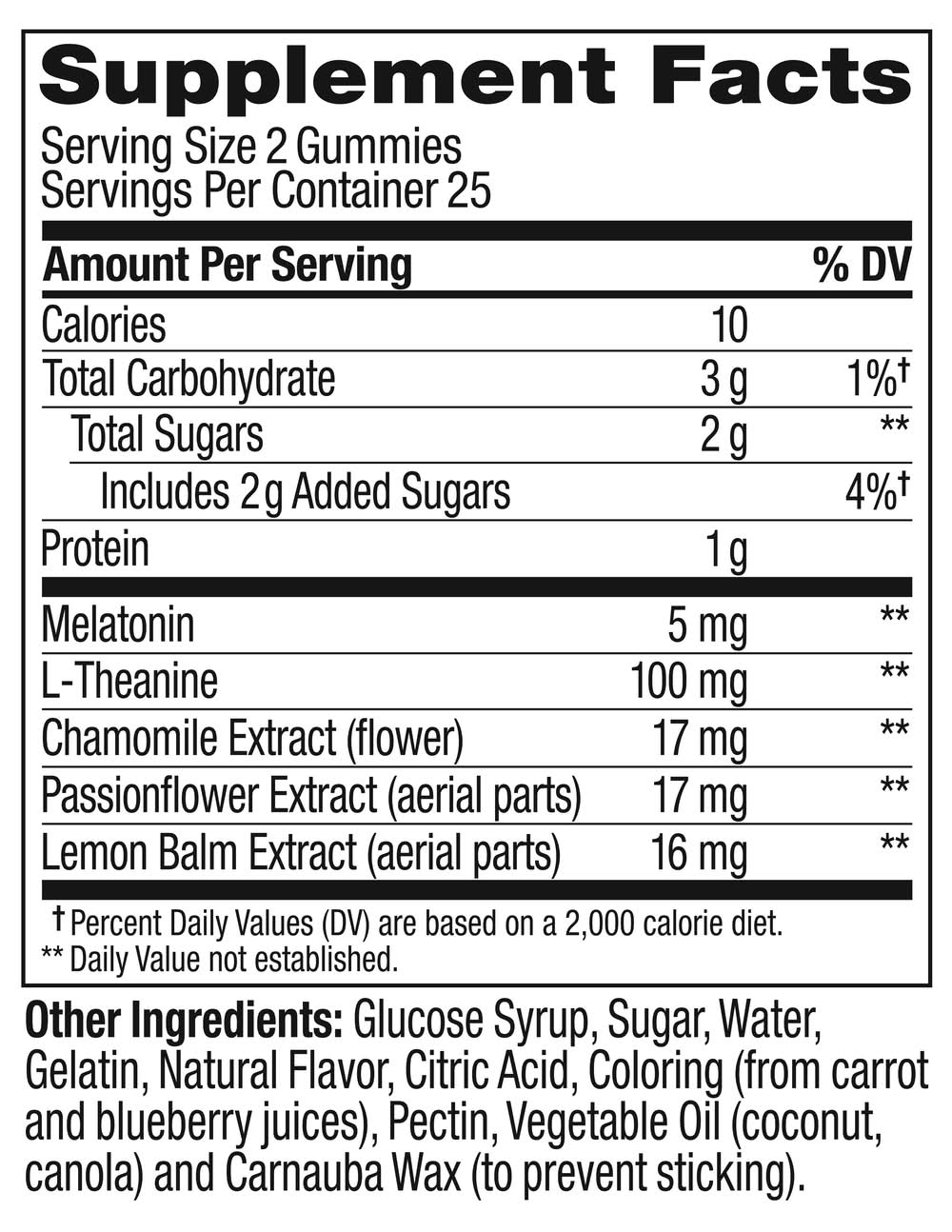Superdose sleep blend features 5mg of Melatonin, a naturally occurring hormone that works with your body's chemistry help boost your natural sleep hormone, mellow your mind and calm your senses so you can relax and enjoy restful sleep* L-Theanine supports calmness and Botanicals like Chamomile, Passionflower & Lemon Balm to help soothe and relax* How to take: Chew two gummies 30 minutes before bed, no food or water needed Naturally flavored Blackberry Zen with a fresh hint of mint 50 gummies per bottle (25 day supply) Unique blend of drug-free, non-habit forming ingredients Made with no artificial colors or flavors and gluten free Delightful and delicious OLLY gummies can be taken together—mix and match as you please Packaging: Reusable