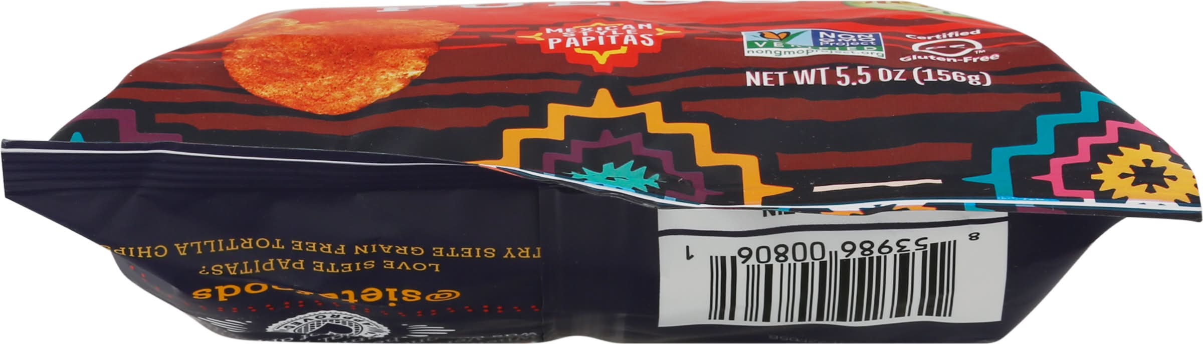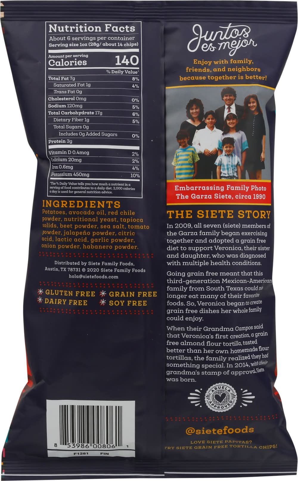 Vegan. Dairy free. Certified Gluten-Free. Soy free. Grain free. Non GMO Project verified. nongmoproject.org. Avocado Oil. Mexican style papitas. Mexican style papitas. Enjoy with family, friends, and neighbors because together is better Embarrassing family photo the Garza Siete, Circa 1990. The Siete Story: In 2009, all seven (siete) members of the Garza family began exercising together and adopted a gran free diet to support Veronica, their sister and daughter, who was diagnosed with multiple autoimmune conditions. Going grain free meant that this third-generation Mexican-American family from South Texas could no longer eat many of their favorite foods, so Veronica began to create grain free dishes her whole family could enjoy. When their Grandma Campos said that Veronica's first creation, a grain free almond flour tortilla, tasted better than her own homemade flour tortillas, the family realized they had something special. In 2014, with their grandma's stamp of approval, Siete was born. Abuela approved(at)sietefoods. Love Siete Papitas. Try Siete grain free tortilla chips. Siete Family Foods, Austin, TX, 78731
