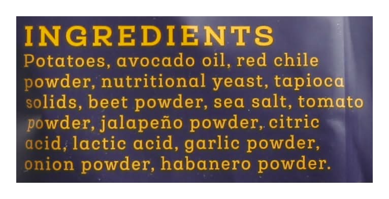 Ingredients: Potatoes, Avocado Oil, Red Chile Powder, Nutritional Yeast, Tapioca Solids, Beet Powder, Sea Salt, Tomato Powder, Jalapeno Powder, Citric Acid, Lactic Acid, Garlic Powder, Onion Powder, Habanero Powder