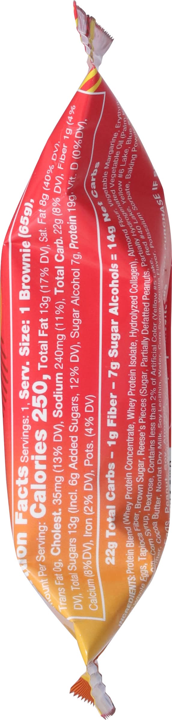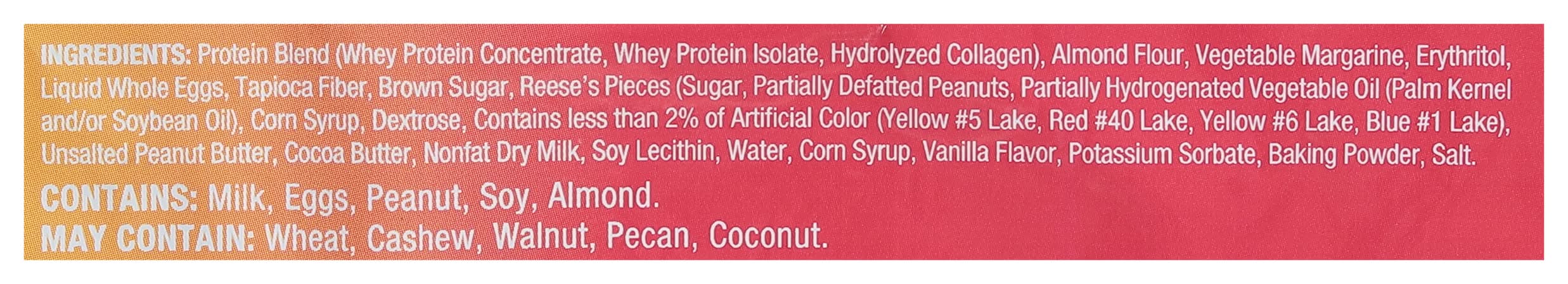 Ingredients: Protein Blend (Whey Protein Concentrate, Whey Protein Isolate, Hydrolyzed Collagen), Almond Flour, Vegetable Margarine, Erythritol, Liquid Whole Eggs, Tapioca Fiber, Brown Sugar, Reese's Pieces (Sugar, Partially Defatted Peanuts, Partially Hydrogenated Vegetable Oil (Palm Kernel and/or Soybean Oil), Corn Syrup, Dextrose, Contains less than 2% of Artificial Color (Yellow 5 Lake, Red 40 Lake, Yellow 6 Lake, Blue 1 Lake), Unsalted Peanut Butter, Cocoa Butter, Nonfat Dry Milk, Soy Lecithin, Water, Corn Syrup, Vanilla Flavor, Potassium Sorbate, Baking Powder, Salt. Contains: Milk, Eggs, Peanuts, Soybeans, Tree Nuts, Almonds, Corn, Wheat, Tree Nuts, Cashews, Tree Nuts, Walnuts/Butternuts, Tree Nuts, Pecans, Tree Nuts, Coconuts