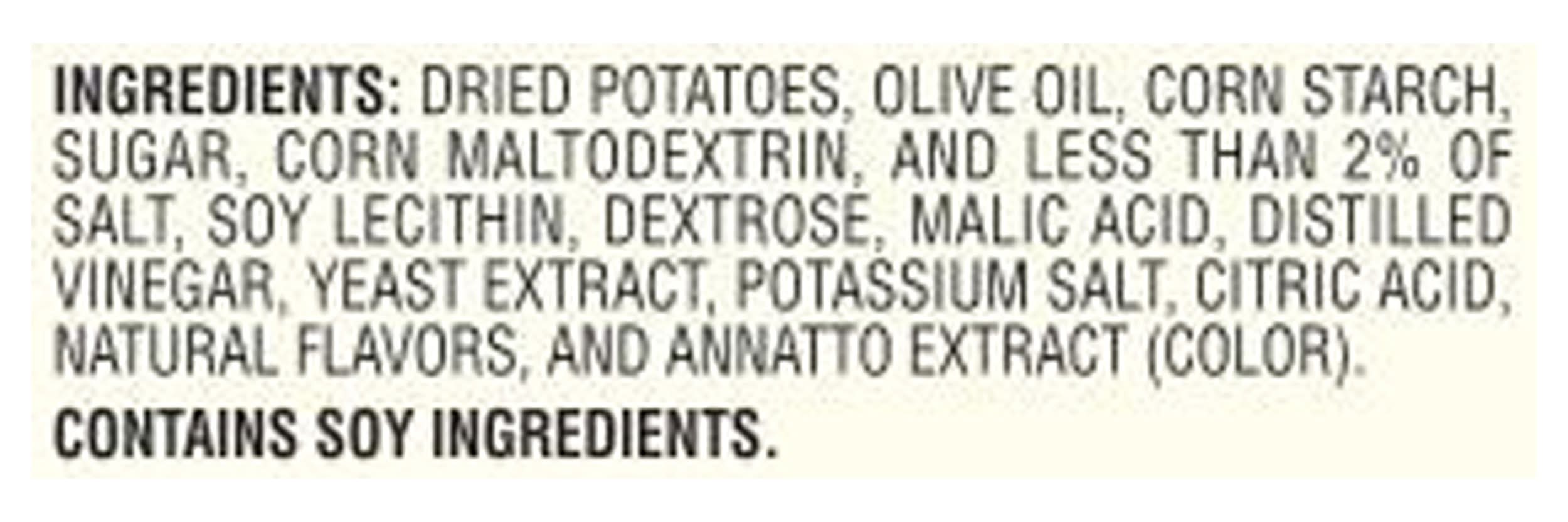 Ingredients: Dried Potatoes, Olive Oil, Corn Starch, Sugar, Corn Maltodextrin, and Less than 2% of Salt, Soy Lecithin, Dextrose, Malic Acid, Distilled Vinegar, Yeast Extract, Potassium Salt, Citric Acid, Natural Flavors, and Annatto Extract (Color) Contains: Soybeans