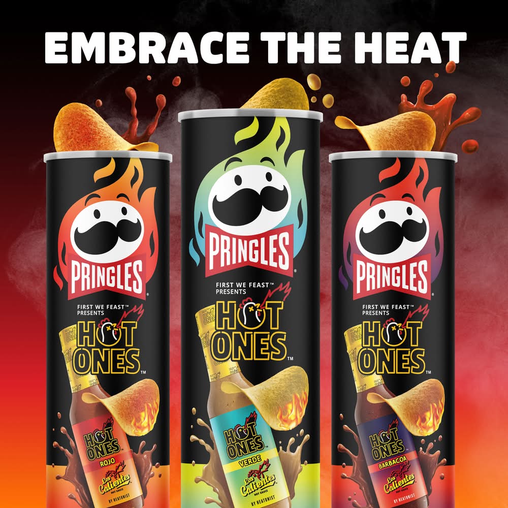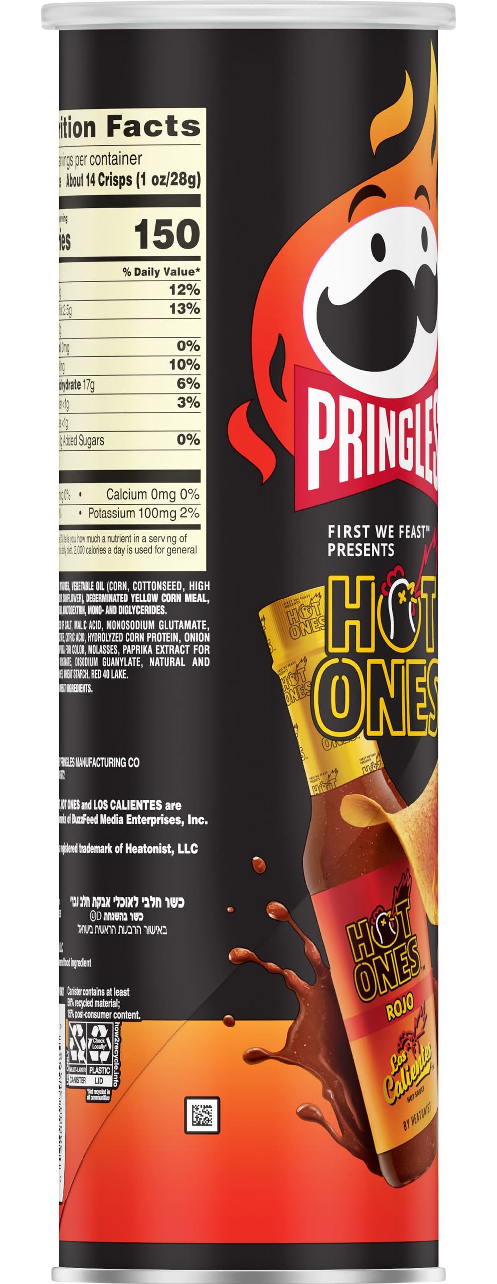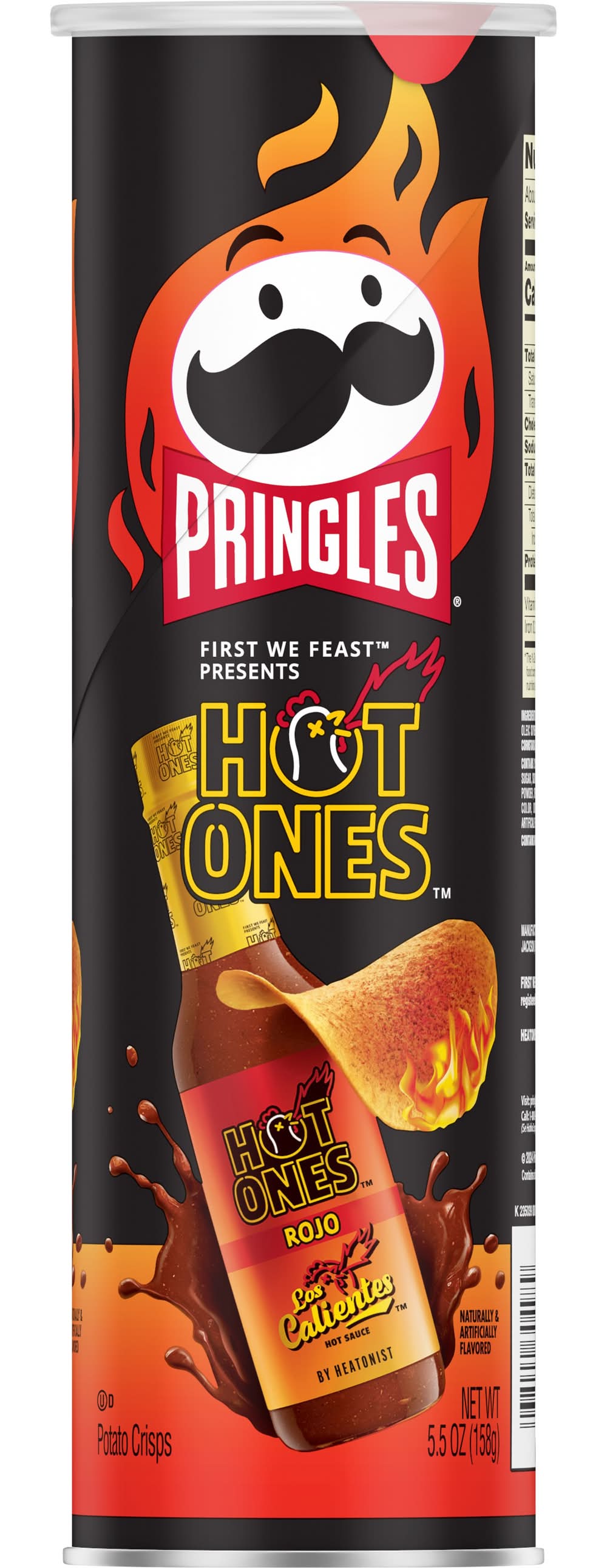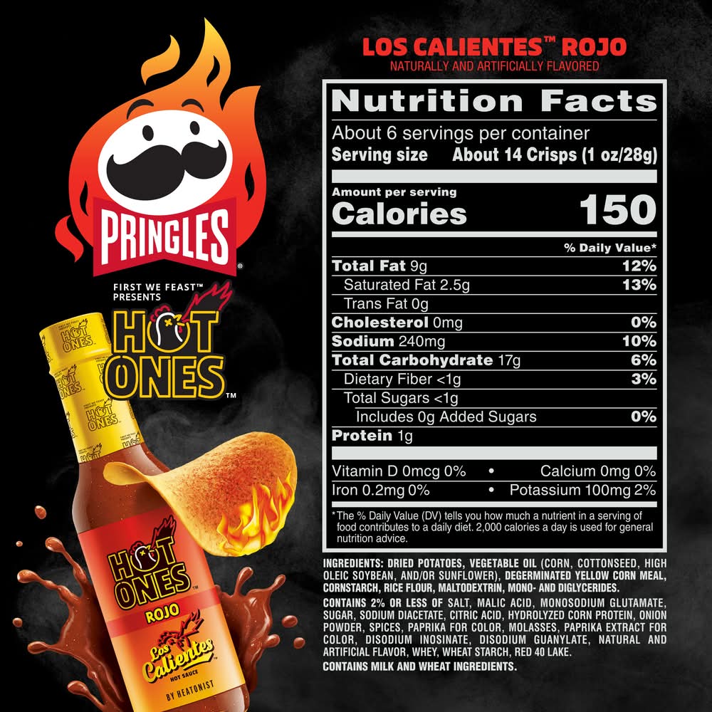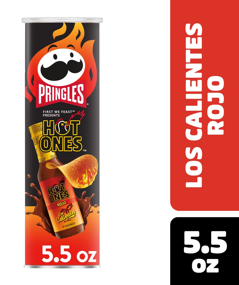 Embrace the heat and crunch into a delicious snack with Los Calientes Rojo crisps. Inspired by the hit celebrity interview show and Los Calientes authentic sauce line, these deliciously spicy chips will be sure to intensify your snack game. Hot sauce flavor in every single bite, these Pringles crisps are seasoned with the sauce plus smoky, savory herbs; The convenient, portable can makes it easy to share and create unforgettable snacking moments. Challenge your friends and see if they can handle the heat! Fire up a flavor explosion at your next cookout, spice up your video game night, or kick your movie marathon up a notch. Get your hands on r-packed snack that'll make you want to reach for an ice-cold glass of milk. • Flavor: Rojo hot • Packaging: Reusable