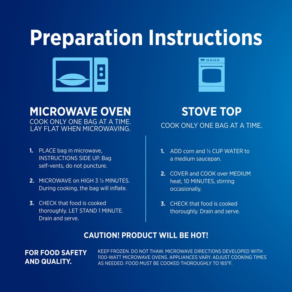 Directions for use: Microwave Instructions: Microwave ovens vary - adjust cooking times as needed to reach 165 degrees F as measured by a food thermometer taken in several spots. 1. Place frozen, unopened bag this side up, laying flat in microwave. Do not pierce bag. For microwaves with a metal rack, remove rack. 2. Microwave on high for the recommended cook time based on your microwave wattage. During cooking, the bag will slowly inflate. A special vent in the bag will allow the steam to escape and a whistling sound may be heard. 3. Let stand for 1 minute after cooking (Stand time is important for food safety). Carefully handle bag at corners marked with the light blue tabs and remove from microwave with two hands. Hold bag over serving dish. Tear bag at notch. Pour, stir and enjoy! Microwave Cooking Time: Wattage: 1200 - 4-1/2 minutes. Wattage: 1000 - 5 minutes. Wattage: 800 - 7 minutes. For microwave ovens less than 800 watts, please use stovetop cooking instructions. Stove Top Instructions: 1. Empty frozen contents of bag into a 2-quart nonstick sauce pan. Add 1/2 water. 2. Cook covered over medium heat for 4 to 5 minutes or until heated through, stirring occasionally. 3. Let stand for 1 minute (Stand time is important for food safety). Do not thaw - Cook thoroughly. For food safety & quality follow these instructions carefully: keep frozen - do not thaw. Cook thoroughly to a temperature of 165 degrees F. Cook only one product at a time. Promptly refrigerate any leftovers. Reheat before serving. Caution! Product will be hot! Keep frozen. Storage recommendation: Keep frozen.