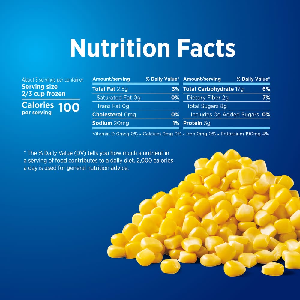 Birds Eye Steamfresh Super Sweet Corn offers a quick, easy vegetable option for your family. Made with specially selected vegetables, this frozen sweet corn is flash frozen to lock in the super sweet taste. This frozen corn is made with no artificial colors, flavors or preservatives to give you only the best for your family. Enjoy the frozen vegetables as an easy side dish or add it to recipes, such as casseroles or corn and black bean salsa. Preparation is simple; just microwave the frozen vegetable in the bag for 3 1/2 minutes on high or cook on the stove for on medium for 10 minutes. Store each bag of corn in the freezer until you're ready to cook it. It’s good to eat vegetables, so Birds Eye makes vegetables good to eat. Conagra Brands, PO Box 3534, Chicago, IL,60654