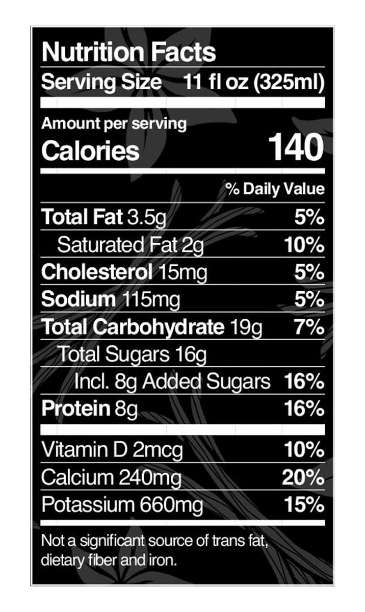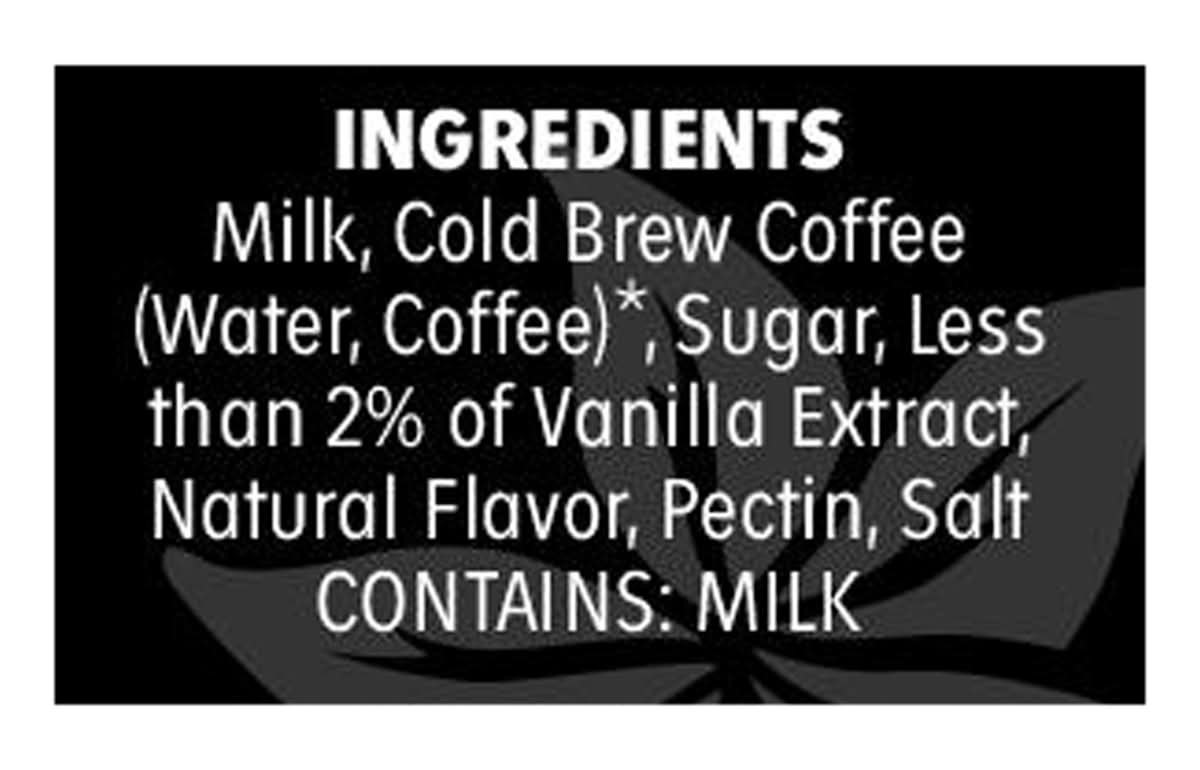 Ingredients: Milk, Cold Brew Coffee (Water, Coffee)*, Sugar, Less than 2% of Vanilla Extract, Natural Flavor, Pectin, Salt. * Fair Trade Certified, Made with 100% Fair Trade Certified Coffee Contains: Milk