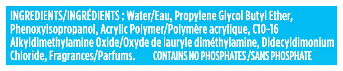 Ingredients: Water/Eau, Propylene Glycol Butyl Ether, Phenoxylsopropanol, Acrylic Pollymer/Polymere Acrylique, C10-16 Alkyldimethylamine Oxide/Oxyde De Lauryle Dimethylamine, Didecyldimonium Chloride, Fragrance/Parfums