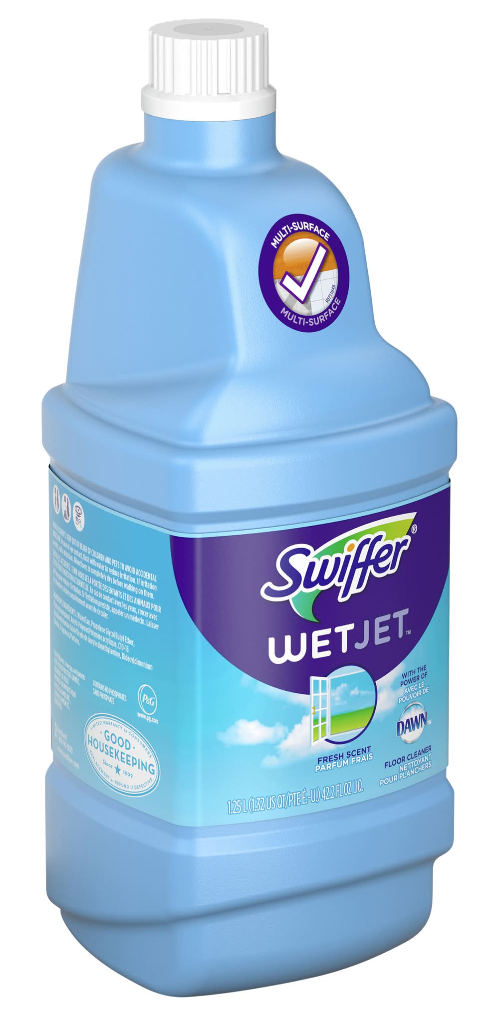 New & Improved Swiffer WetJet Multi-Surface Floor Cleaner is a pre-mixed cleaning solution made specially for the Swiffer WetJet all-in-one power mop. It's safe* and fast drying formula dissolves dirt and tough, sticky messes to reveal the natural beauty of your floors. Procter & Gamble, Cincinnati,OH,45202,