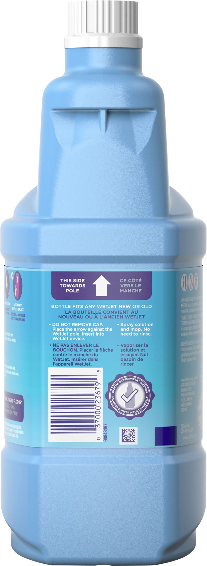 Do not remove cap. place the arrow against the wetjet pole. insert into wetjet device. spray solution and mop. no need to rinse. 1 insert; 2 spray & clean; 3 eject empty bottles & replace. refill multi-surface cleaner; pre-mixed cleaning solution dissolves dirt and cough, sticky messes. safe on all floors (do not use on unfinished, oiled or waxed wooden boards, non-sealed tiles or carpeted floors because they may be water sensitive) (wood and laminate, marble, stone, ceramic tile, vinyl and linoleum), avoid accidents: keep out of reach of children and pets to avoid accidental ingestion. in case of eye contact, flush with water to reduce irritation. if irritation persists, call a physician. allow floors to completely dry before walking on them.