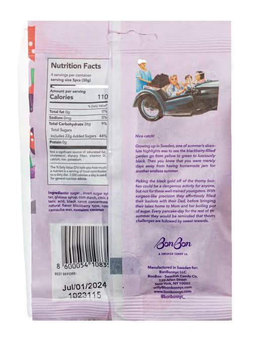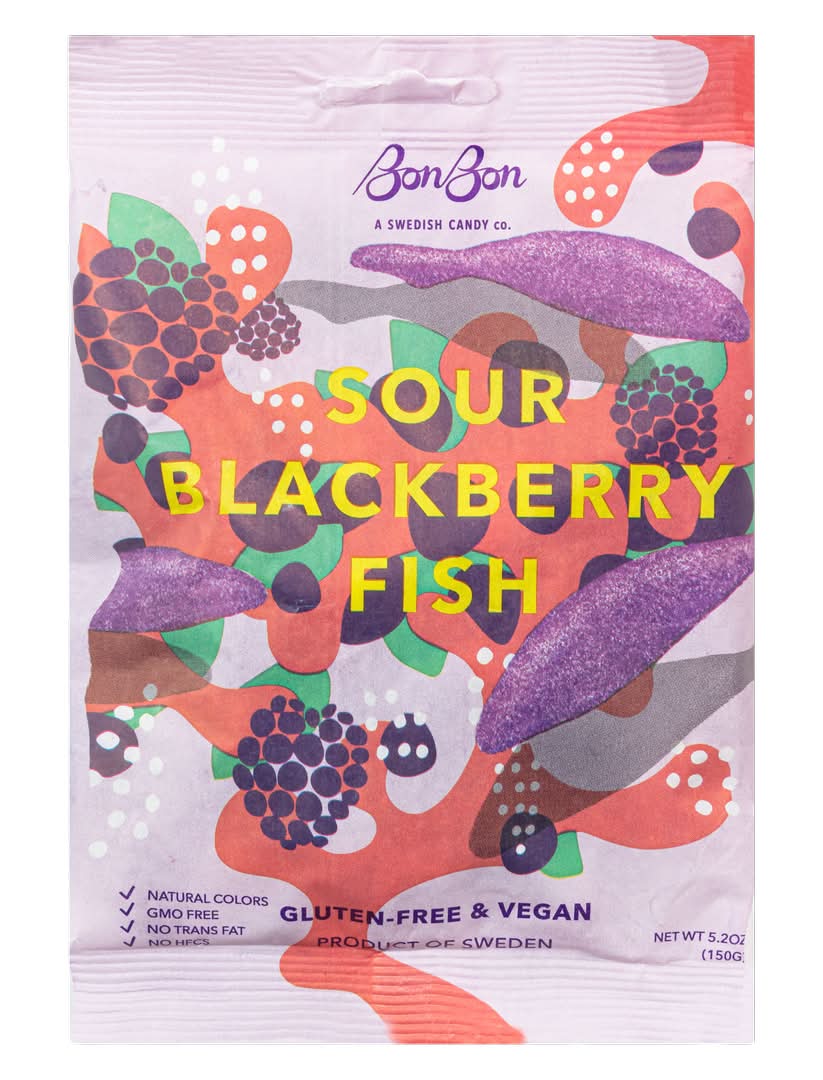 BonBon Swedish Candy: Sour Blackberry Fish are a commemoration of the homemade jam we used to make with freshly picked blackberries from our summer gardens in Sweden.