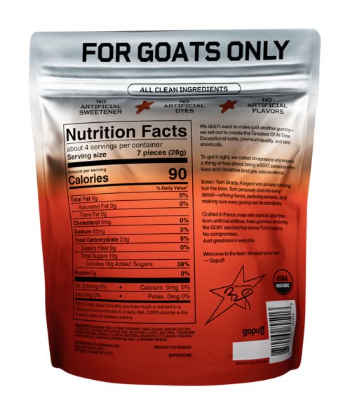 Created with Tom Brady. Made in France. Powered by real fruit. Only on Gopuff. Introducing - the ultimate snack for those who don’t mess around. This wild mix of tangerine, apricot, and grapefruit is bursting with real organic fruit. No fake stuff. No compromises. Just greatness, in gummy form. Сrafted in France with elite ingredients and Brady-level standards: -USDA Organic -No artificial sweeteners -No artificial dyes -No artificial flavors Sweet just got an upgrade. Exclusively on Gopuff. Flavor: Tropic fusion