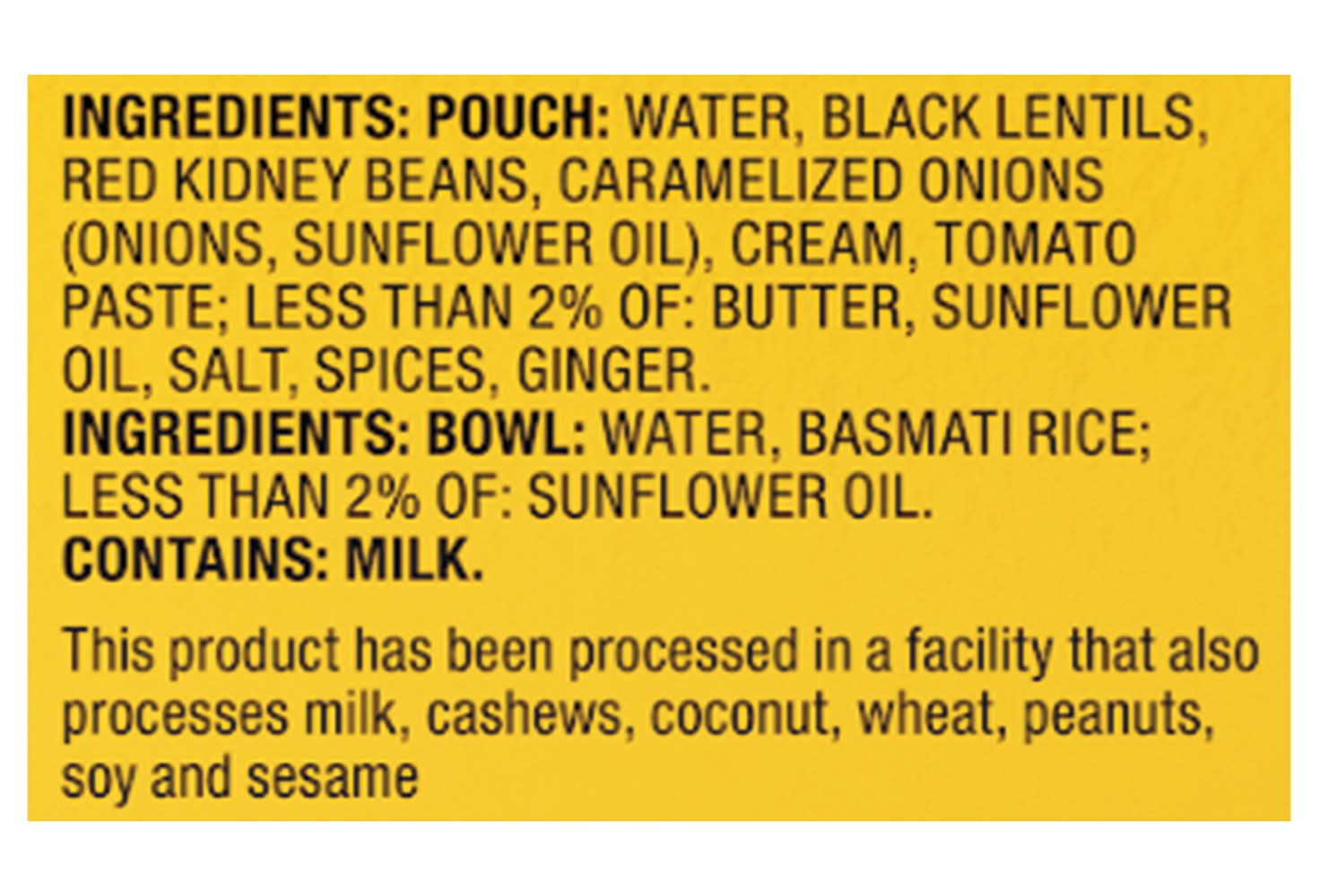 Ingredients: Pouch: Water, Black Lentils, Onion, Red Kidney Beans, Cream, Tomato Paste, Butter, Sunflower Oil, Salt, Ginger, Cumin, Chili Pepper. Bowl: Water, Organic Basmati Rice, Sunflower Oil Contains: Milk, Wheat, Tree Nuts, Soybeans, Milk