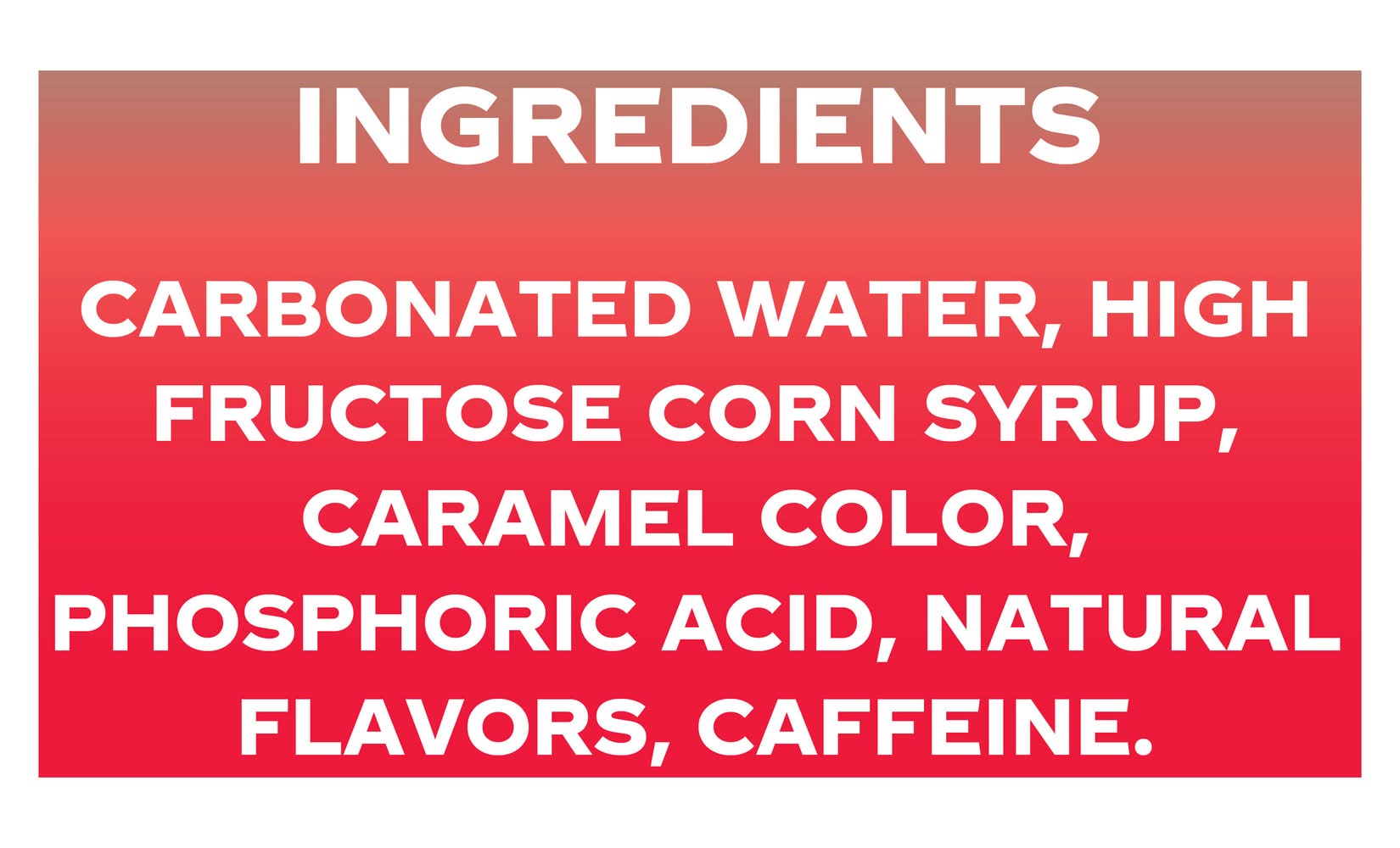Ingredients: Carbonated Water, High Fructose Corn Syrup, Caramel Color, Phosphoric Acid, Natural Flavors, Caffeine Contains: Corn Contains 57mg of caffeine