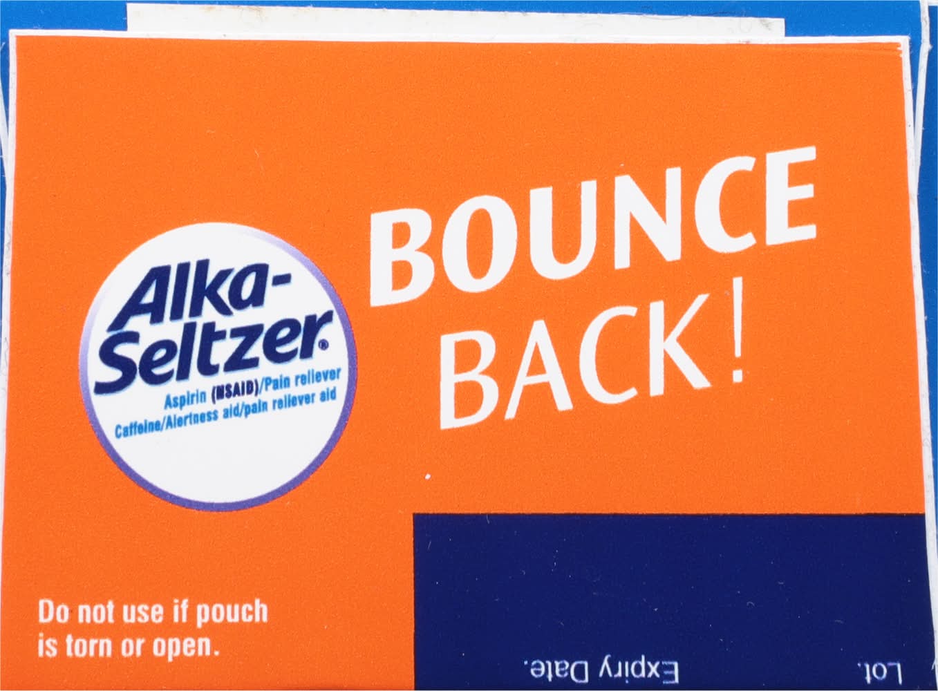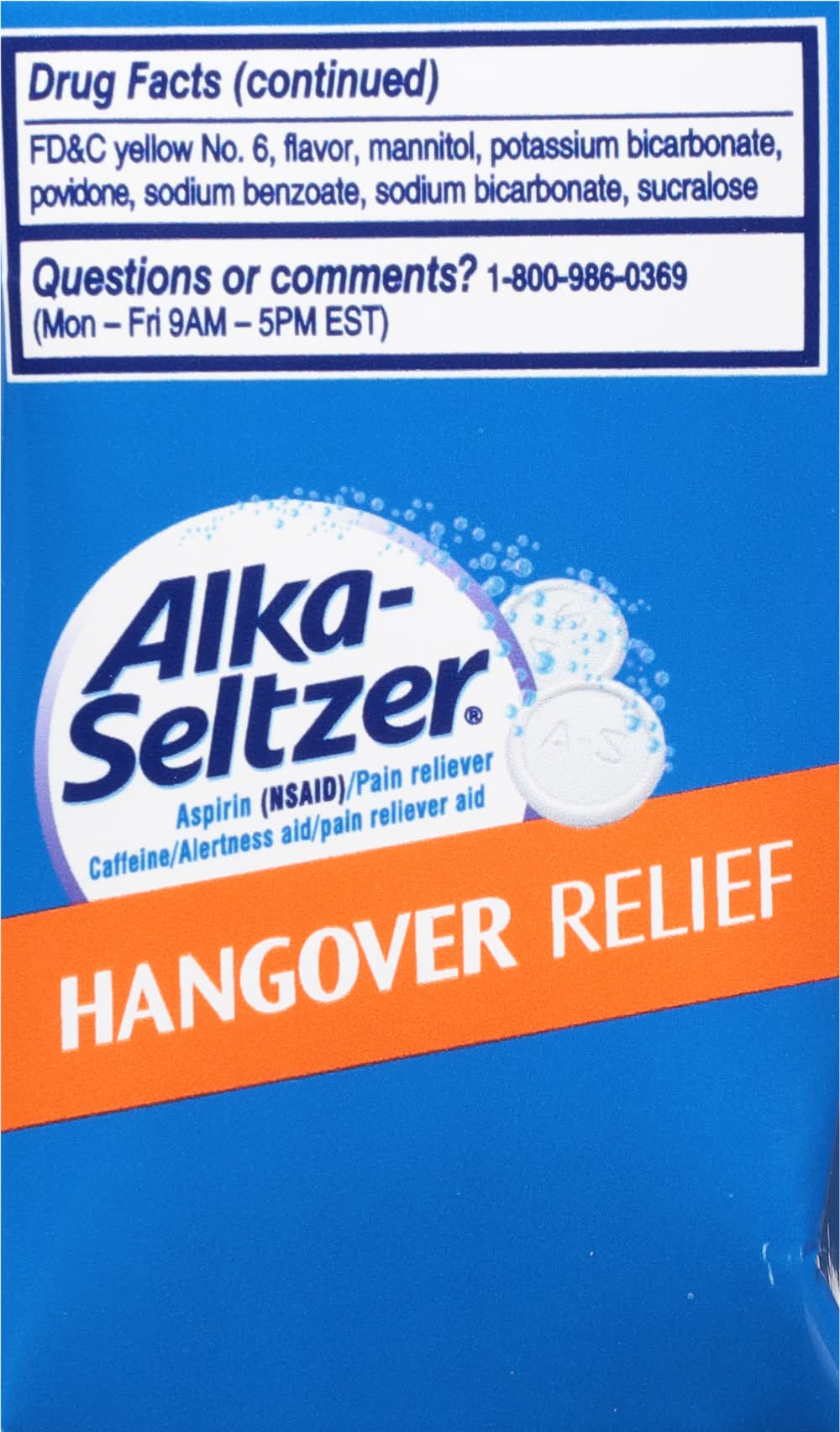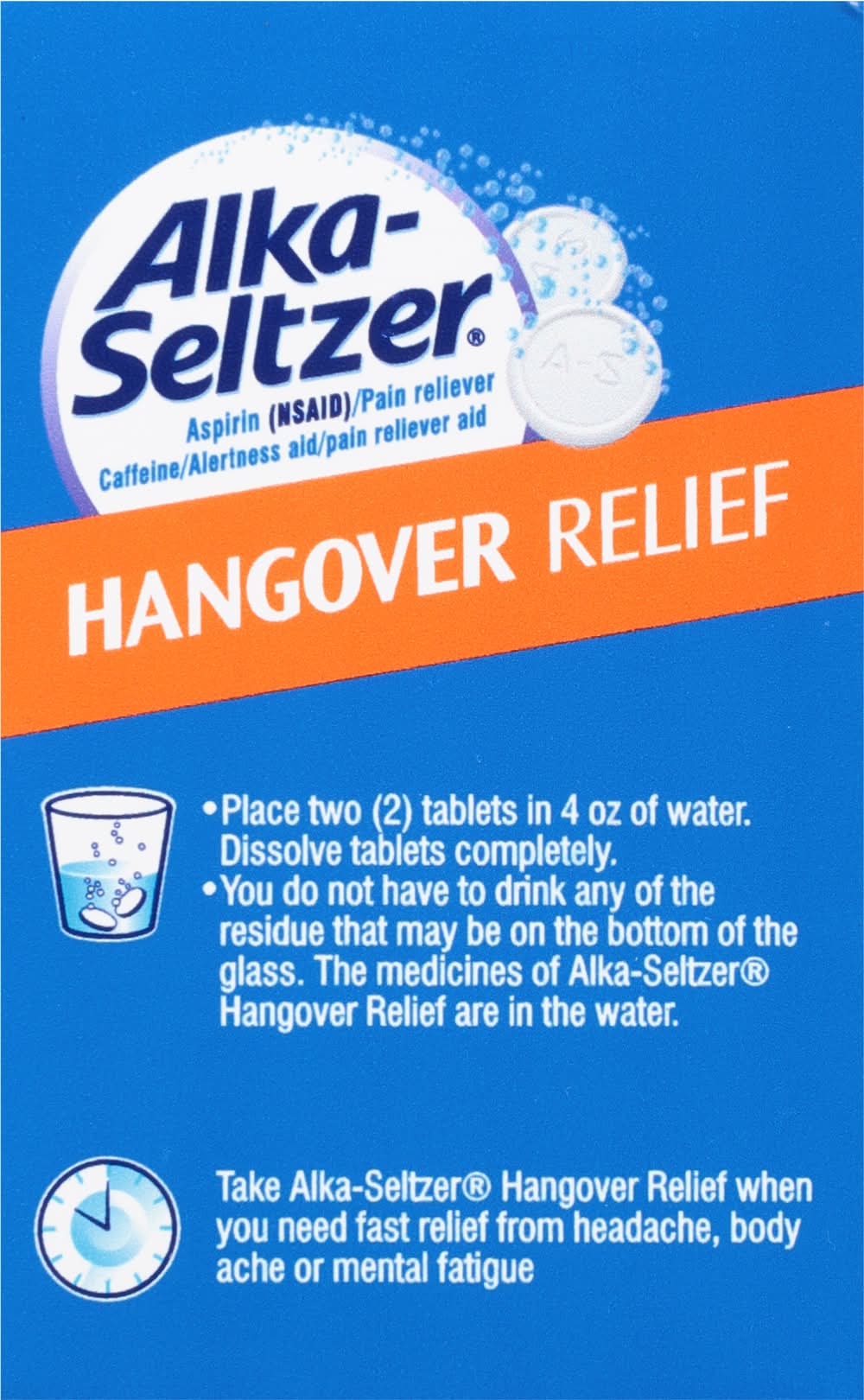 In each tablet directions: directions: fully dissolve 2 tablets in 4 ounces of water before taking. adult 18 years and over: 2 tablets every 6 hours as needed, or as directed by a doctor. do not exceed 8 tablets in 24 hours. adults 60 years and over: 2 tablets every 6 hours as needed, or as directed by a doctor. do not exceed 5 tablets in 24 hours. children under 18 years: consult a doctor. place two (2) tablets in 4 oz of water. dissolve tablets completely. you do not have to drink any of the residue that may be on the bottom of the glass. the medicines of alka-seltzer hangover relief are in the water. take alka-seltzer hangover relief when you need fast relief from headache, body ache or mental fatigue.