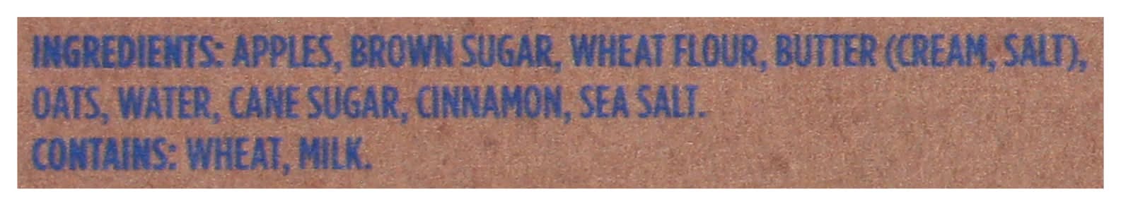 Ingredients: Apples, Brown Sugar, Wheat Flour, Butter (Cream, Salt), Oats, Water, Cane Sugar, Cinnamon, Sea Salt Contains: Wheat, Milk, Oat