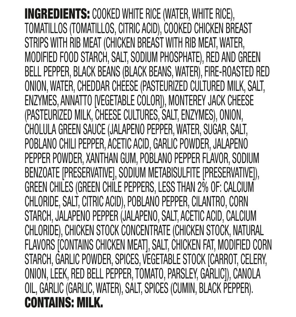 Ingredients: COOKED WHITE RICE WATER, WHITE RICE), TOMATILLOS (TOMATILLOS, CITRIC ACID, COOKED CHICKEN BREAST STRIPS WITH RIB MEAT CHICKEN BREAST WITH RIB MEAT, WATER, MODIFIED FOOD STARCH, SALT, SODIUM PHOSPHATE), RED AND GREEN BELL PEPPER, BLACK BEANS (BLACK BEANS, WATER), FIRE-ROASTED RED ONION, WATER, CHEDDAR CHEESE (PASTURIZED CULTURED MILK, SALT, ENZYMES, ANNATTO VEGETABLE COLOR), MONTEREY JACK CHEESE (PASTEURIZED MILK, CHEESE CULTURES, SALT, ENZYMES), ONION, CHOLULA GREEN SAUCE (JALAPENO PEPPER, WATER, SUGAR, SALT, POBLANO CHILI PEPPER, ACETIC ACID, GARLIC POWDER, JALAPENO PEPPER POWDER, XANTHAN GUM, POBLANO PEPPER FLAVOR, SODIUM BENZOATE PRESERVATIVE, SODIUM METABISULFITE (PRESERVATIVE], GREEN CHILES GREEN CHILE PEPPERS, LESS THAN 2% OF: CALCIUM CHLORIDE, SALT CITRIC ACID, POBLANO PEPPER, CILANTRO, CORN STARCH, JALAPENO PEPPER (JALAPENO, SALT, ACETIC ACID, CALCIUM CHLORIDE), CHICKEN STOCK CONCENTRATE (CHICKEN STOCK, NATURAL FLAVORS [CONTAINS CHICKEN MEATI, SALT, CHICKEN FAT, MODIFIED CORN STARCH, GARLIC POWDER, SPICES, VEGETABLE STOCK [CARROT, CELERY, ONION, LEEK, RED BELL PEPPER, TOMATO, PARSLEY, GARLIC), CANOLA OIL, GARLIC (GARLIC, WATER), SALT, SPICES (CUMIN, BLACK PEPPER). CONTAINS: MILK. Contains: milk