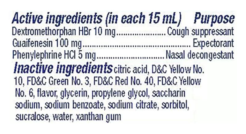 Ingredients: In Each 15 mL: Active Ingredients: Dextromenthorphan HBr (10 mg), Cough Suppressant; Guaifenesin (100 mg), Expectorant; Phenylephrine HCl (5 mg), Nasal Decongestant. Inactive Ingredients: Citric Acid, D&C Yellow 10, FD&C Green 3, FD&C Red 40, FD&C Yellow 6, Flavor, Glycerin, Propylene Glycol, Saccharin Sodium, Sodium Benzoate, Sodium Citrate, Sorbitol, Sucralose, Water, Xanthan Gum